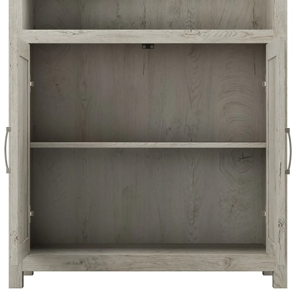 The Bush Furniture Knoxville Tall 5 Shelf Bookcase with Doors offers a practical storage and display solution with appealing modern farmhouse style. Use the top of the bookshelf cabinet to brighten up any room with pictures and decorations or organize a collection of paperback and hardcover books. Two of the upper shelves can be raised or lowered to accommodate items of various sizes, and the bottom storage cabinet also contains an adjustable shelf so larger materials can be kept in order but out of sight. Each shelf supports up to 50 pounds. Hardware is included to anchor the tall bookshelf to a wall for maximum stability in your home office, living room, entryway or any other residential space. This Tall Bookcase has been tested to meet ANSI/SOHO quality standards for safety and performance and is backed by the Bush Furniture 3 Year Manufacturer’s Warranty.