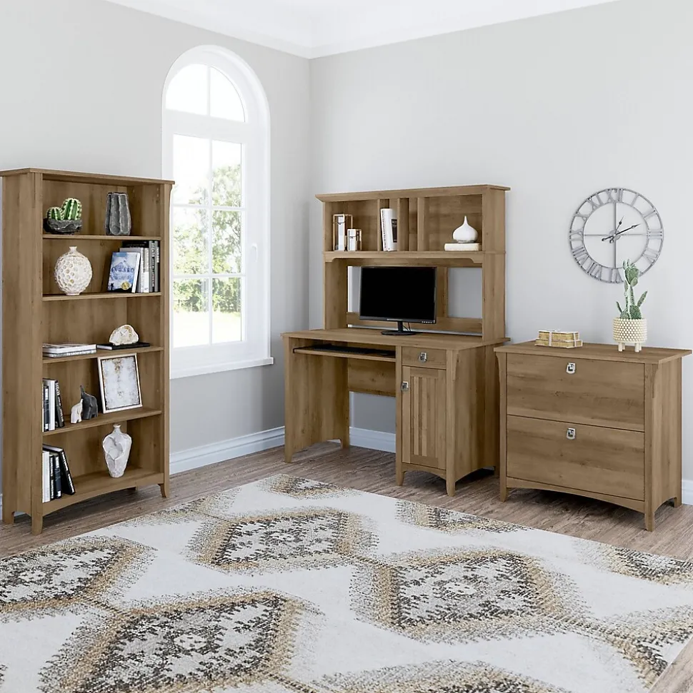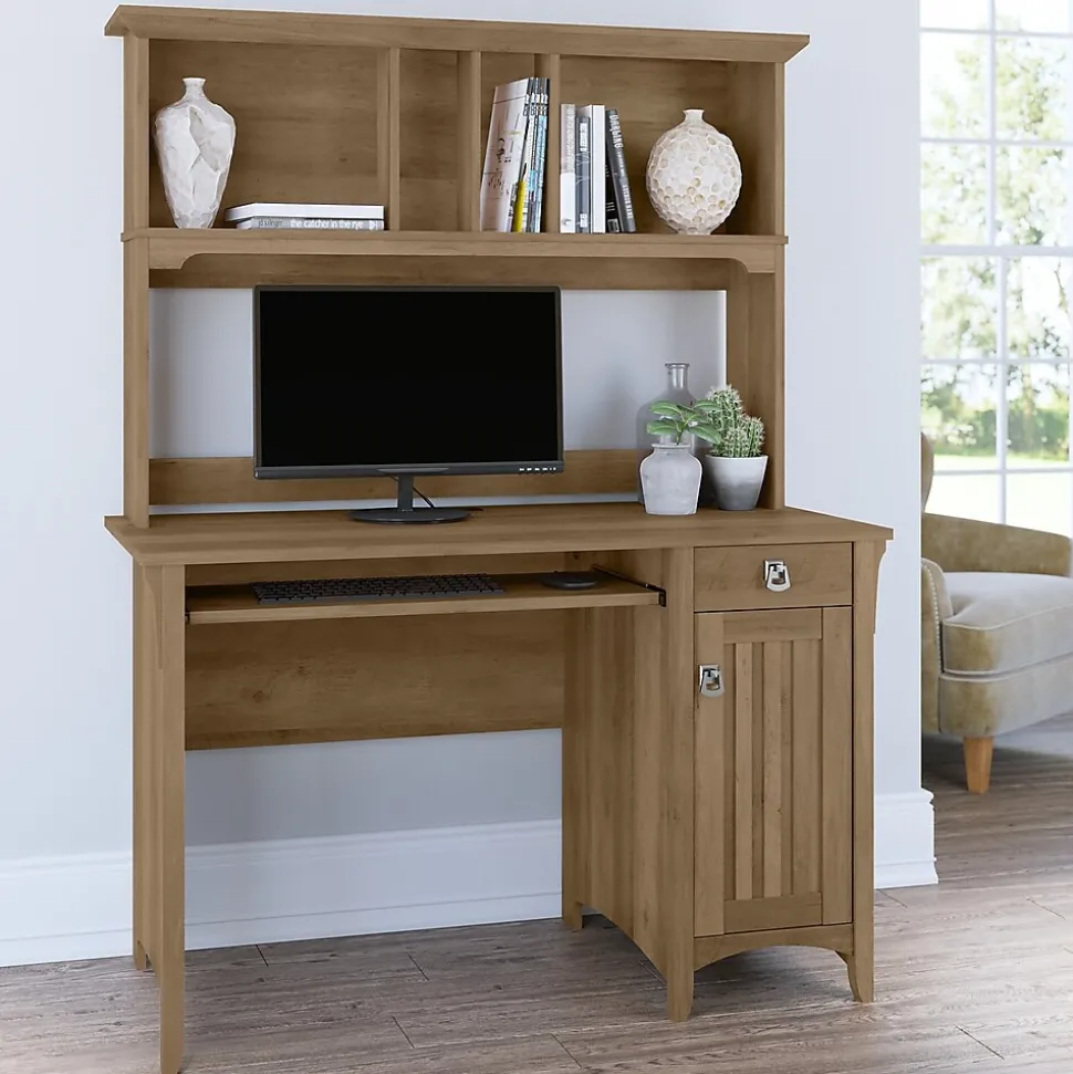 The Bush Furniture Salinas small computer desk with hutch takes timeless Mission styling and adds plenty of modern touches to help you complete your daily tasks. Technology-ready features include a pullout keyboard tray or laptop shelf and a work surface with a built-in wire management system to keep cords and cables in order. The hutch has plenty of storage space for work in progress, books, decorations, and more while the 48″W desk features a vertical cabinet with one adjustable shelf along with a box drawer to organize office supplies and writing utensils. This computer desk is perfect for small spaces. The compact design boasts a sturdy construction with clean lines, tapered legs, and attractive wood detailing. The durable desktop supports up to 150 lbs. and offers ample space to complete projects and assignments, pay bills, or surf the web. This home office desk set is backed by a 1-year warranty.