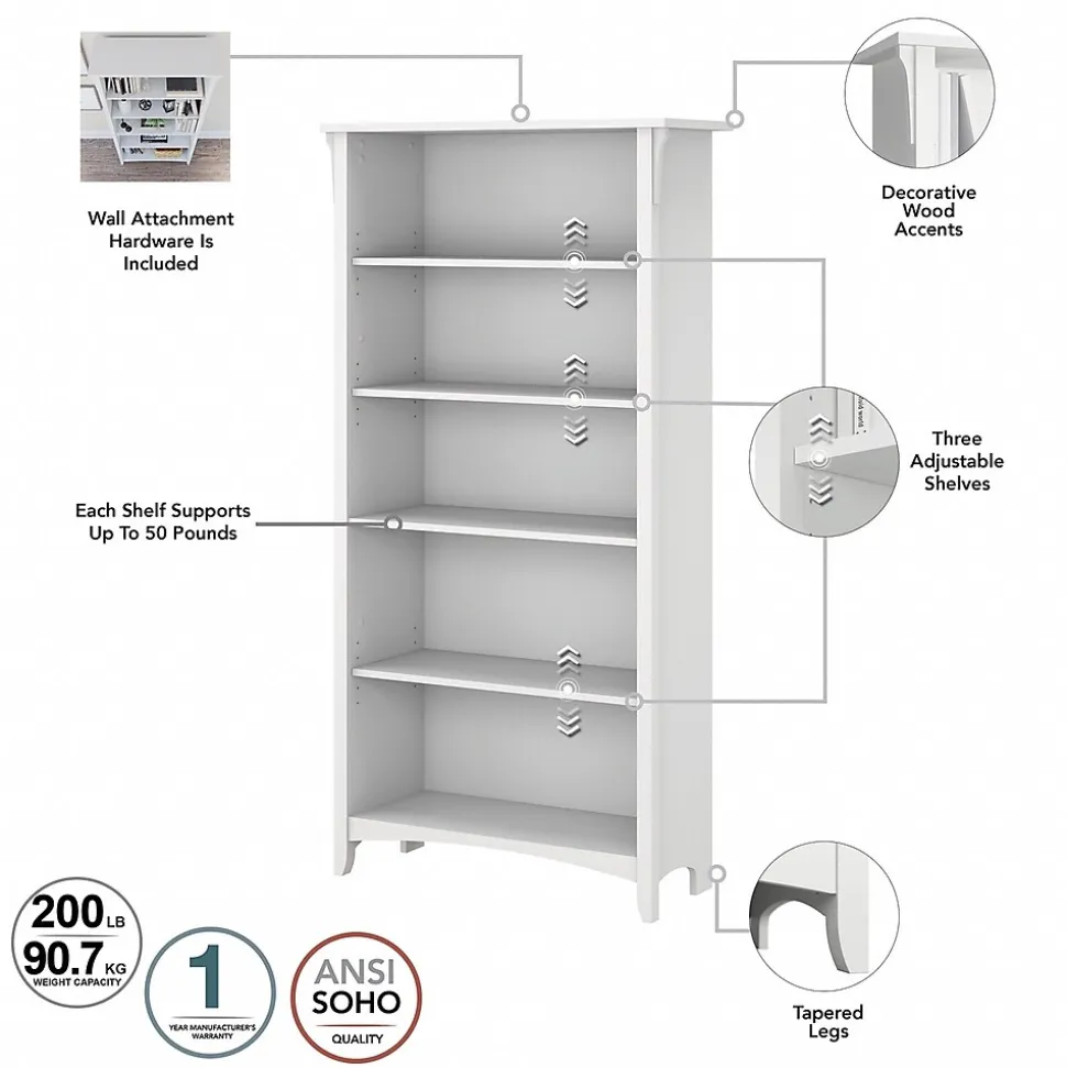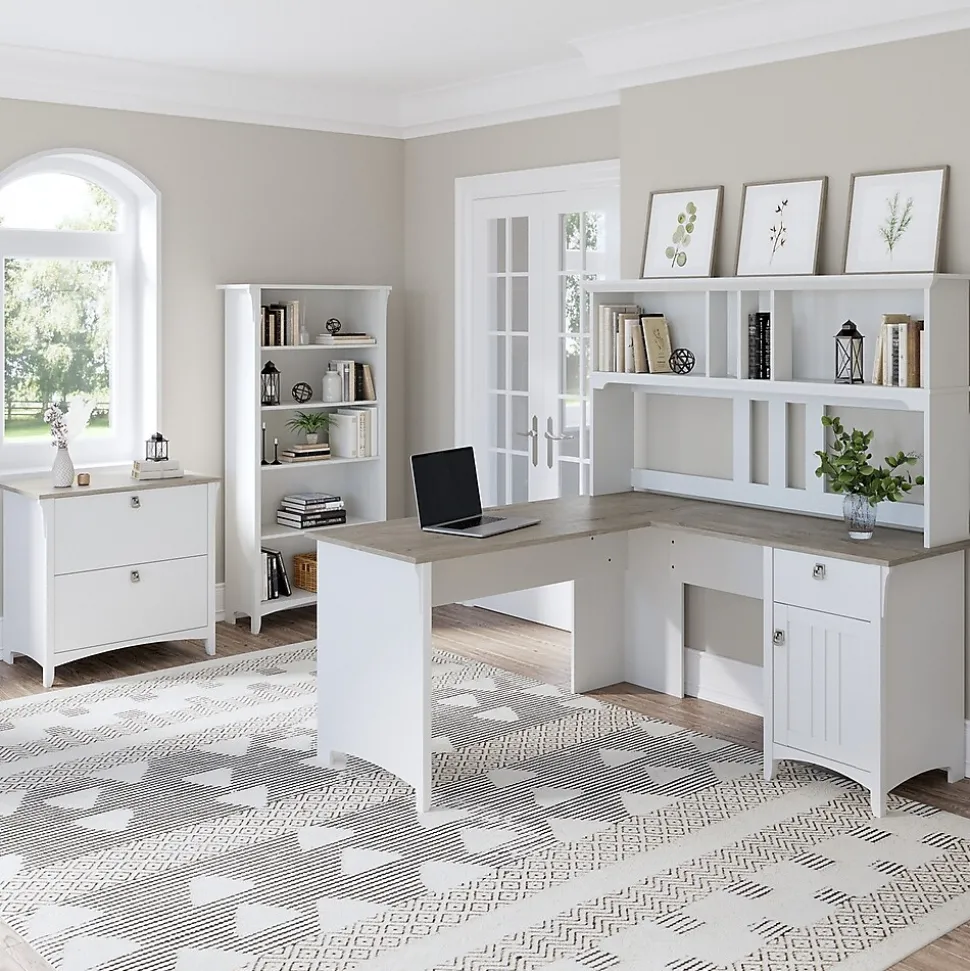 The Bush Furniture Salinas 60″W L-shaped desk with hutch, lateral file cabinet, and five-shelf bookcase offers a comprehensive home office solution with casual style. Spread out and multitask on the L-shaped desk’s surface designed to save space by fitting into a corner. Store writing utensils and supplies in the convenient box drawer and keep larger items in a cabinet with an adjustable shelf. The hutch attaches to either side of the computer desk and features two large cubby areas as well as two smaller spaces for storage and display. The two-drawer file cabinet opens on full-extension ball bearing slides for an easy reach to legal- and letter-size documents. A pair of fixed shelves give the bookcase stability while three adjustable shelves accommodate items of various sizes. This corner desk set is tested to meet ANSI/SOHO quality standards for safety and performance.
