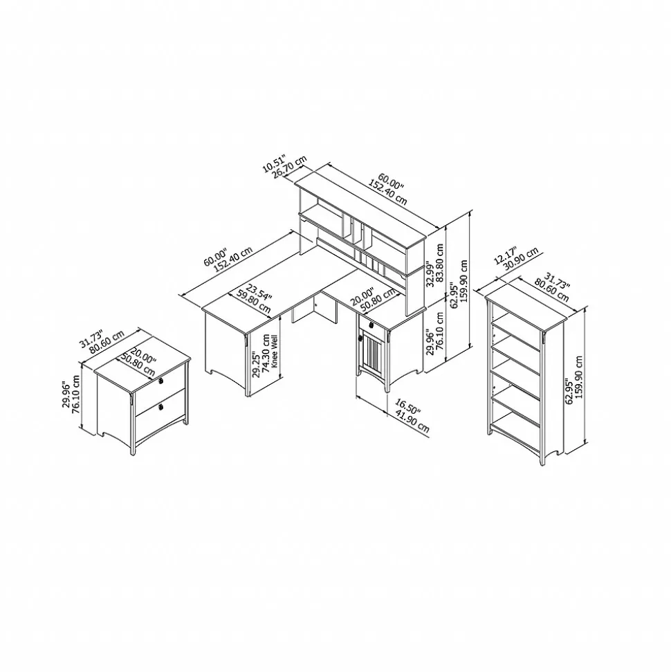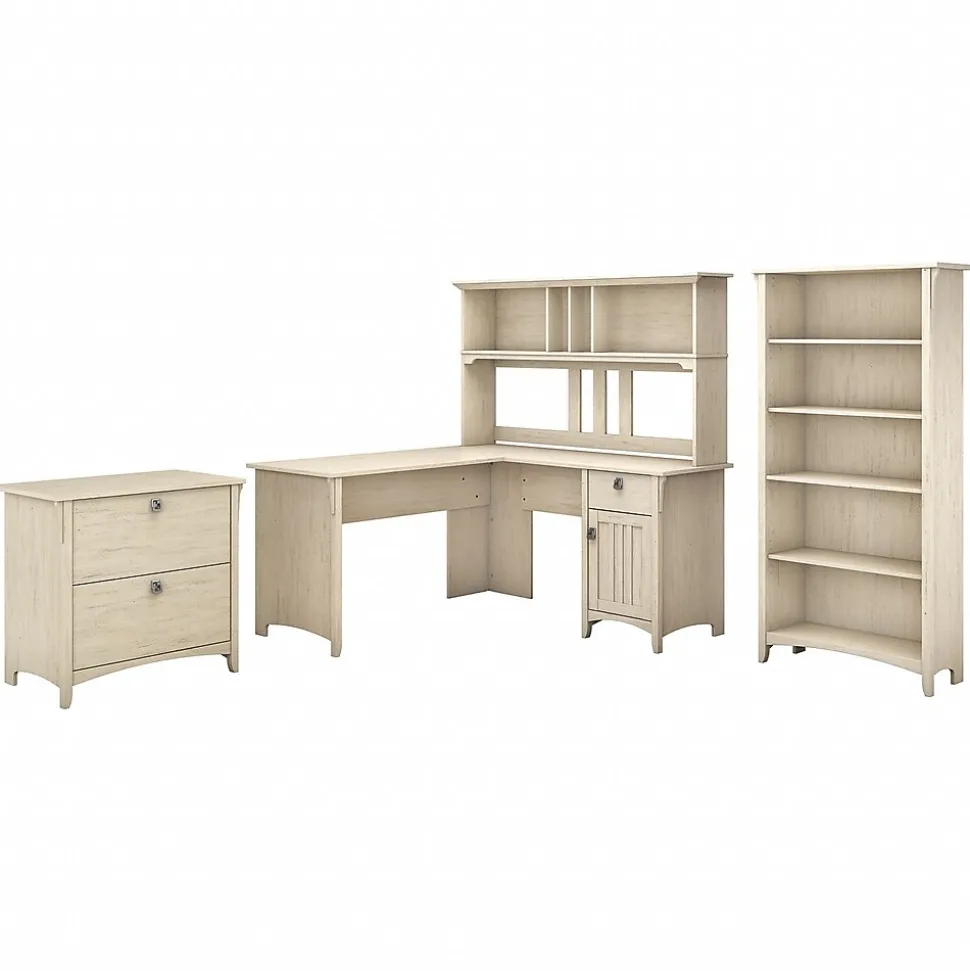 The Bush Furniture Salinas 60W L Shaped Desk with Hutch, Lateral File Cabinet and 5 Shelf Bookcase offers a comprehensive home office solution with casual style. Spread out and multitask on the L Shaped surface, designed to save space by fitting into a corner. Store writing utensils and supplies in the convenient box drawer and keep larger items in a cabinet with an adjustable shelf. The Hutch attaches to either side of the corner desk and features 2 large cubby areas as well as 2 smaller spaces for storage and display. The 2 drawer filing cabinet opens on full-extension ball bearing slides for an easy reach to legal and letter size documents. A pair of fixed shelves give the Bookcase stability while 3 adjustable shelves accommodate items of various sizes. This furniture set is tested to meet ANSI/SOHO quality standards for safety and performance and is backed by a 1 year warranty.