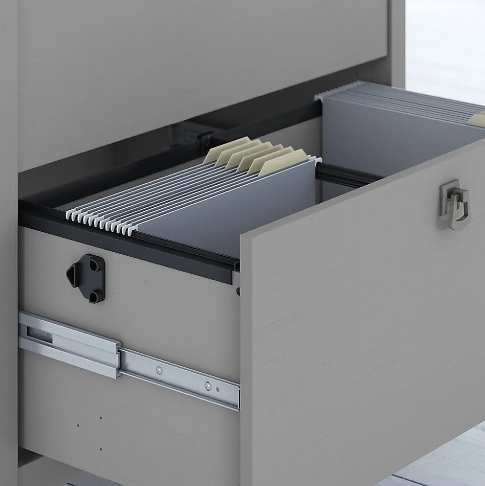 - Lateral File Cabinet drawers open on full-extension ball bearing slides and hold legal and letter size documents
