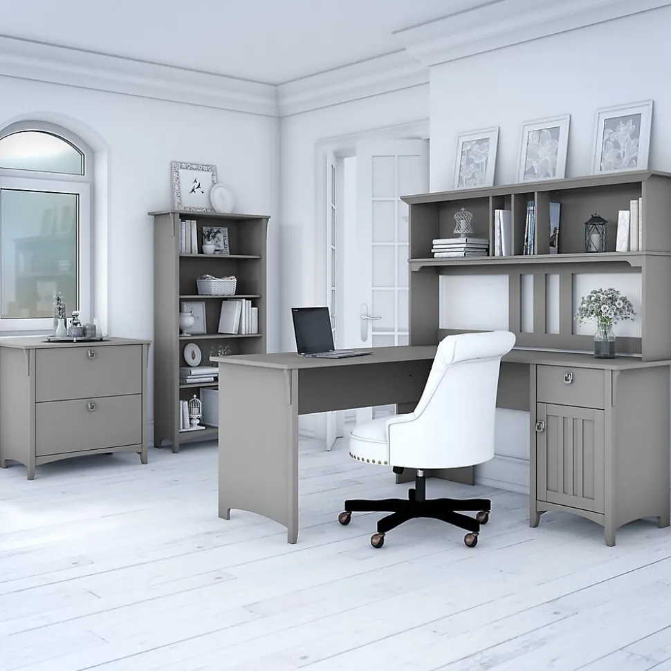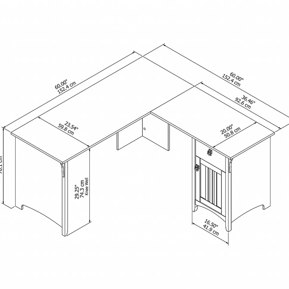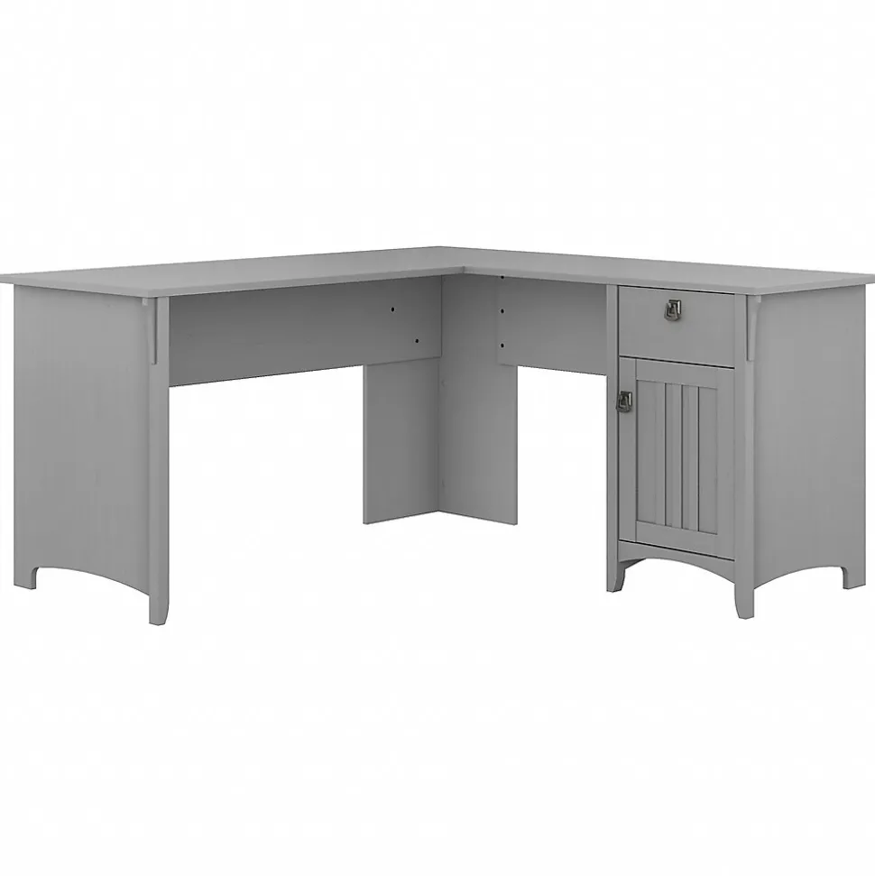Make your home office space comfortable, functional and beautiful with the Bush Furniture Salinas L Shaped Desk with Storage. Attractive wood details, vertical accents, curved base rails and tapered legs inspired by Mission style create a casual look fit for a cottage, family home or apartment. You’ll love all the room you have to multitask on the L Shaped Desk surface, designed to save space in your home with a variety of placement options, including in the corner. Surf the net, pay bills, read a good book or the morning paper, and enjoy all the legroom you need with the open design. Store writing utensils and small office supplies in the convenient box drawer and keep larger items in a storage cabinet that features an adjustable shelf. The corner desk with storage is tested to meet ANSI/SOHO quality standards for safety and performance and is backed by a 1 year manufacturer’s warranty.