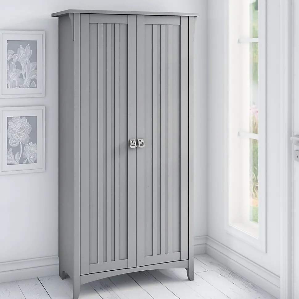 Organize your home with an accent cabinet that combines casual style with a convenient, versatile design. The Bush Furniture Salinas tall storage cabinet with doors features five concealed shelves for keeping miscellaneous household items, office supplies and entertainment essentials in order and out of sight. Three adjustable shelves can be moved up or down to accommodate bulky items like binders and photo albums while the two remaining shelves are fixed for stability.