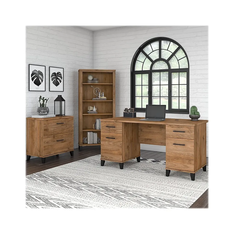 Add a touch of professional style to your workspace with the Bush Furniture Somerset 60″ office desk with lateral file cabinet and five-shelf bookcase. The spacious 60″ surface with wire management slots provides plenty of room to spread out with a computer, paperwork, and more. Two file drawers and a pair of box drawers easily accommodate supplies and documents. The file cabinet opens on smooth ball bearing slides for an easy reach to legal-, letter-, and A4-size paperwork. Two of the bookcase’s shelves are fixed for stability and three are adjustable to ensure that items of all sizes have their place. Transitional styling includes your choice of attractive finishes with tapered leg accents and contemporary metal hardware. This home office furniture set is tested to meet ANSI/SOHO quality standards for safety and performance and is backed by the Bush Furniture 6-year manufacturer’s warranty.