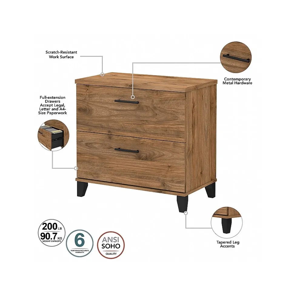 - Two-drawer lateral file cabinet has interlocking mechanism to reduce the likelihood of tipping