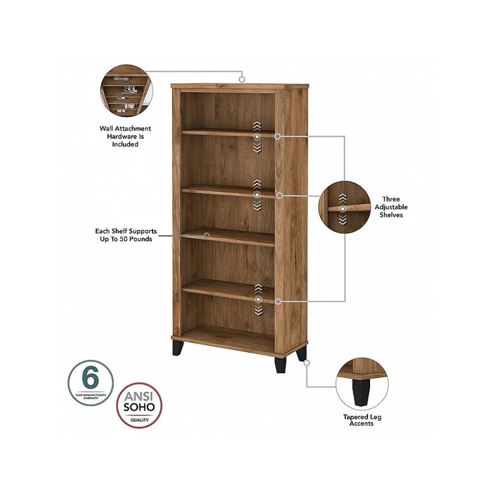 - Bookcase utilizes two fixed shelves for stability and three adjustable shelves for versatile organization
