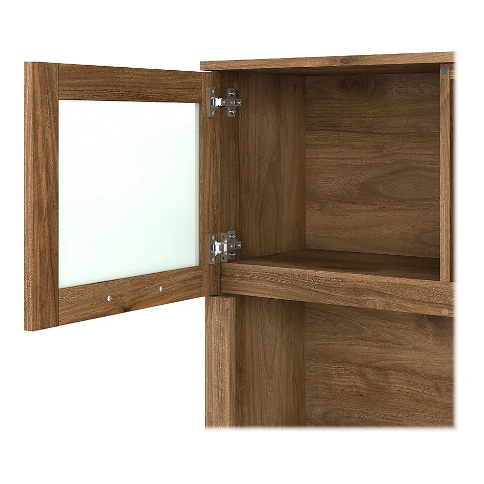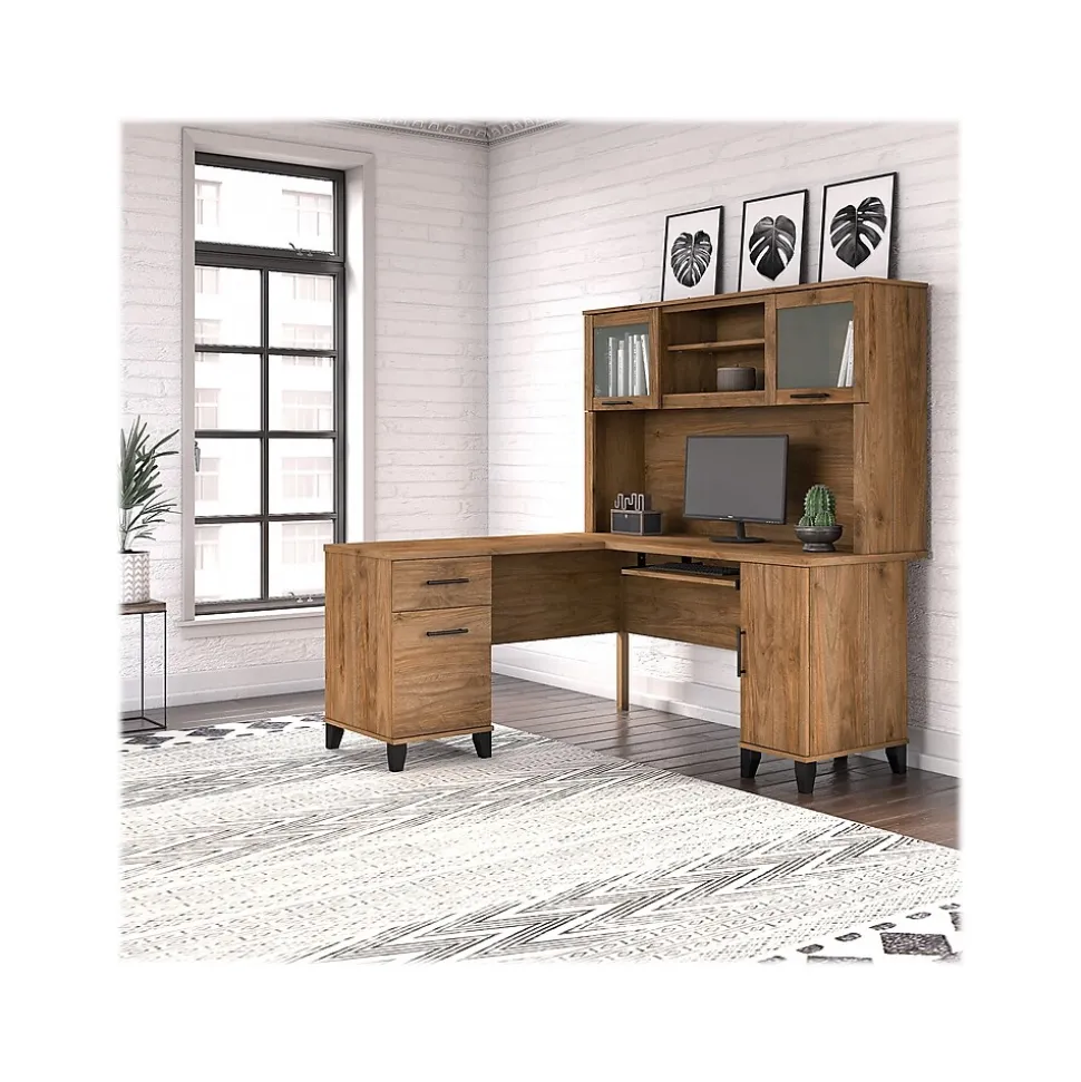 Maximize the potential of your home office with the Bush Furniture Somerset 60″W L-shaped desk with hutch. Create your remote work headquarters with space for a computer, phone, printer, and more. A convenient pullout shelf provides a perfect place to keep a keyboard or laptop, while a storage cabinet and box drawer offer plenty of storage for supplies. A file drawer with ball bearing slides allows for easy access to letter-size documents. Wire management slots help keep cords and cables in order. The hutch features open storage with a large compartment for books or decorations, an adjustable shelf to hold work-in-progress, and two frosted glass doors that provide concealed storage. This home office furniture set is tested to meet ANSI/SOHO standards for safety and performance and is backed by the Bush Furniture 6-year manufacturer limited warranty. American-made with US and imported parts.