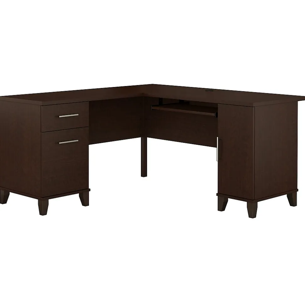 Maximize the potential of your home office with the Bush Furniture Somerset 60W L Shaped Desk. Create your remote work headquarters with space for a computer, phone, printer and more on a surface that features wire management slots for keeping cords and cables in order. A convenient pull-out shelf provides a perfect place to keep a keyboard or laptop, and the Desk also includes a vertical storage cabinet with an adjustable shelf. Place pens, paper and more in the box drawer, and enjoy a file drawer gliding on smooth ball bearing slides for an easy reach to documents. Transitional styling includes a stylish finish with tapered legs and contemporary metal hardware for an alluring appearance. This quality office desk is tested to meet ANSI/SOHO standards for safety and performance and is backed by the Bush Furniture 6 Year Manufacturer’s Warranty. American made with U.S. and imported parts.