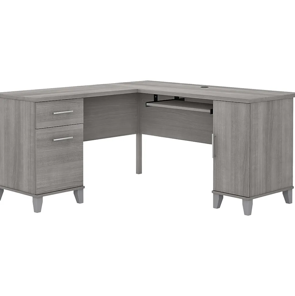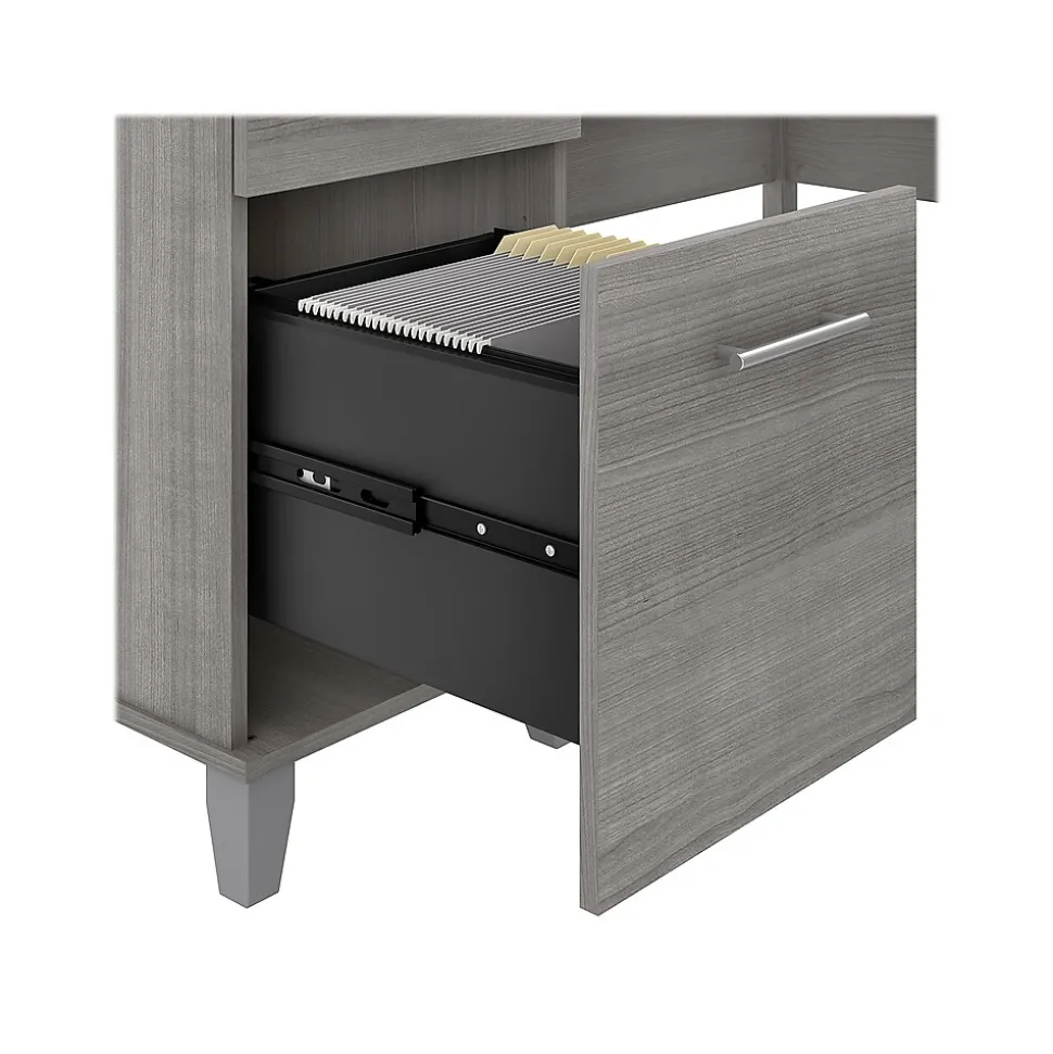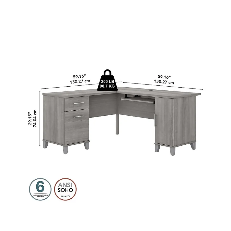 Build your ideal home office around the Bush Furniture Somerset 60″W L-shaped desk featuring transitional style and plenty of storage space for work materials. Maximize the potential of your home office with this desk. Create your remote work headquarters with space for a computer, phone, printer, and more on a surface that features a wire management grommet for keeping cords and cables in order. A convenient pull-out tray provides a perfect place to keep a keyboard or laptop, and the desk also includes a vertical storage cabinet with an adjustable shelf. Place pens, paper, and more in the box drawer, and enjoy a file drawer gliding on smooth ball bearing slides for an easy reach to documents. The transitional styling includes an elegant finish with tapered legs and contemporary metal hardware for an alluring appearance. This L-shaped desk with storage is tested to meet ANSI/SOHO standards for safety and performance and is backed by the Bush Furniture 6-year manufacturer warranty. American-made with US and imported parts.