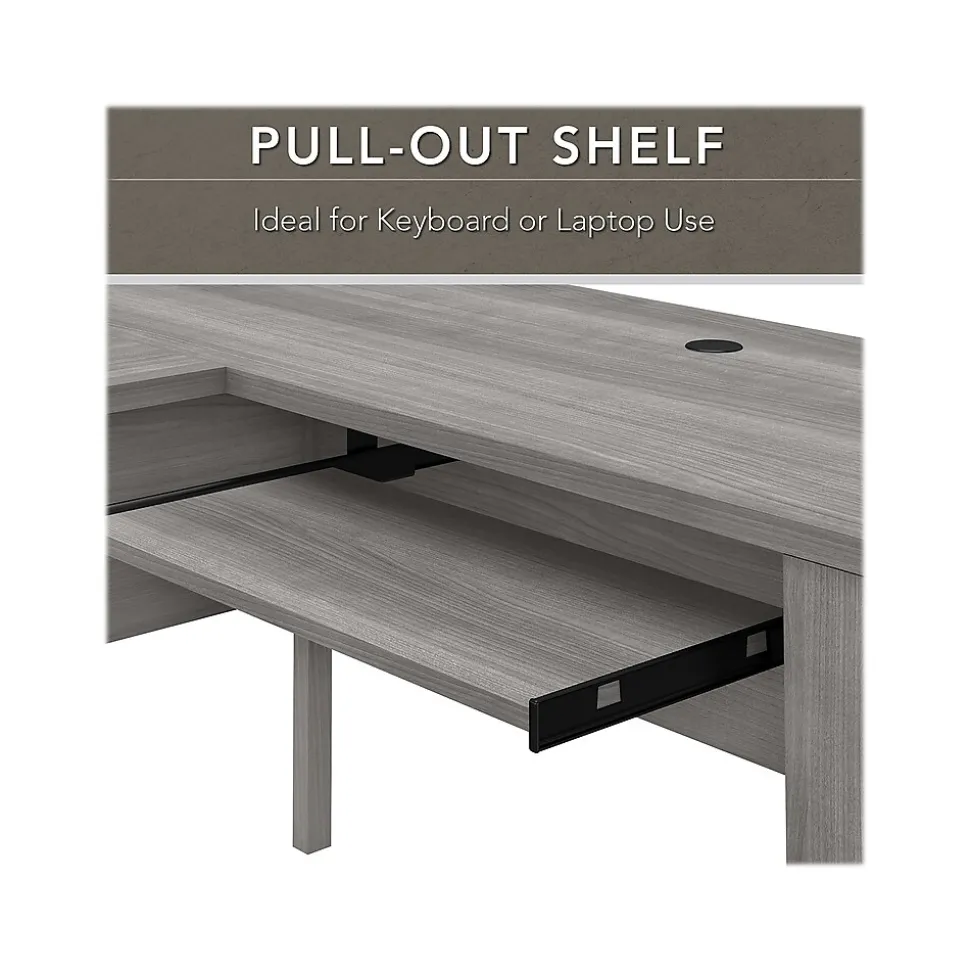 - 60″W L-shaped desk surface with wire management grommet provides plenty of room for materials
