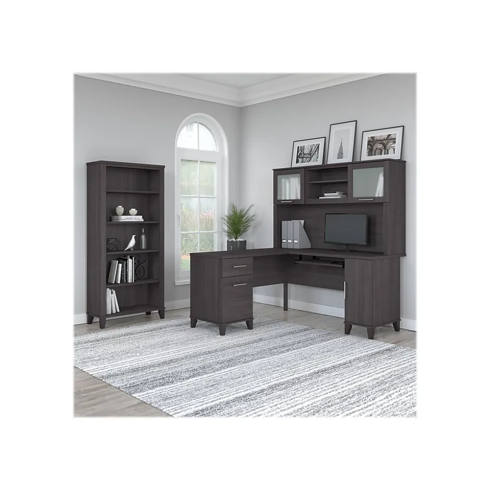 Build your ideal home office around the Bush Furniture Somerset 60″W L-shaped desk featuring transitional style and plenty of storage space for work materials. Maximize the potential of your home office with this L-shaped desk. Create your remote work headquarters with the space for a computer, phone, printer, and more on a surface that features wire management grommets for keeping cords and cables in order. A convenient pullout tray provides a perfect place to keep a keyboard or laptop, and the desk also includes a vertical storage cabinet with an adjustable shelf. Place pens, paper, and more in the box drawer, and enjoy a file drawer gliding on smooth ball bearing slides for an easy reach to documents. The desk in transitional styling offers an elegant finish with tapered legs and contemporary metal hardware for an alluring appearance. This L-shaped desk with storage is tested to meet ANSI/SOHO standards for safety and performance and is backed by the Bush Furniture 6-year manufacturer limited warranty. American-made with US and imported parts.