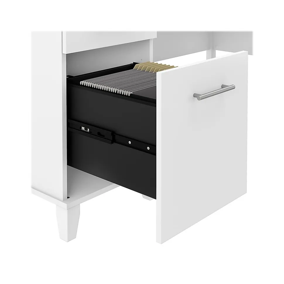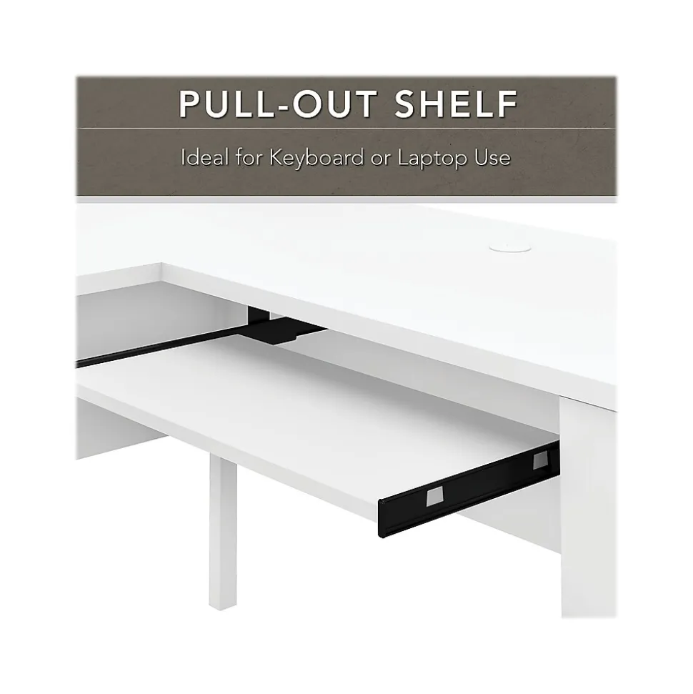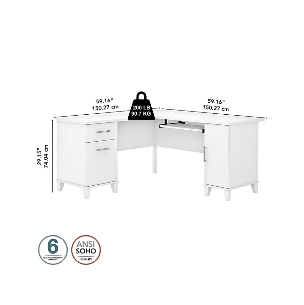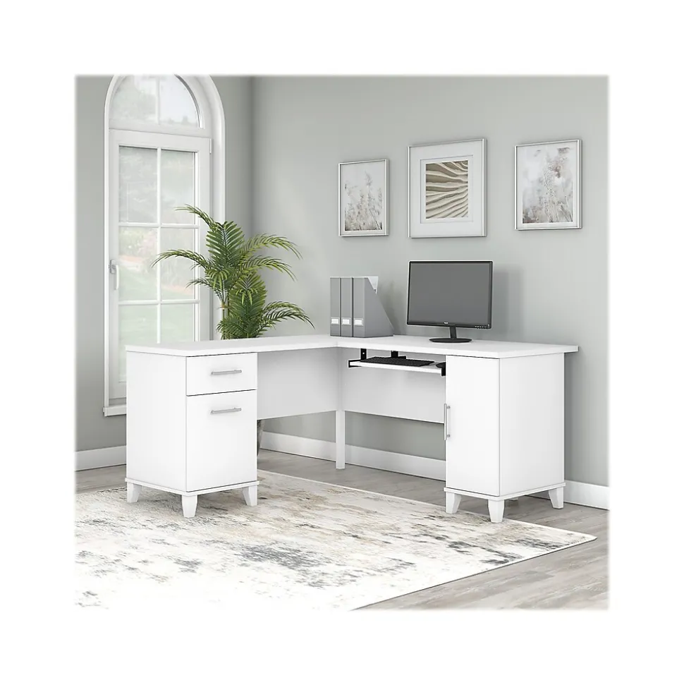 Build your ideal home office around the Bush Furniture Somerset 60″W L-shaped desk featuring transitional style and plenty of storage space for work materials. Maximize the potential of your home office with this L-shaped desk. Create your remote work headquarters with the space for a computer, phone, printer, and more on a surface that features wire management grommets for keeping cords and cables in order. A convenient pullout tray provides a perfect place to keep a keyboard or laptop, and the desk also includes a vertical storage cabinet with an adjustable shelf. Place pens, paper, and more in the box drawer, and enjoy a file drawer gliding on smooth ball bearing slides for an easy reach to documents. The desk in transitional styling offers an elegant finish with tapered legs and contemporary metal hardware for an alluring appearance. This L-shaped desk with storage is tested to meet ANSI/SOHO standards for safety and performance and is backed by the Bush Furniture 6-year manufacturer limited warranty. American-made with US and imported parts.