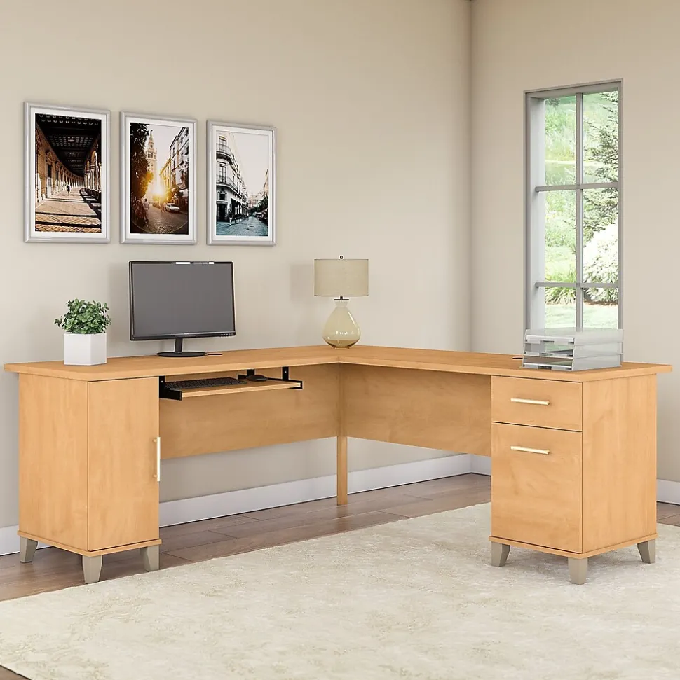 Maximize the potential of your home office with the Bush Furniture Somerset 72W L Shaped Desk. Create your remote work headquarters with space for a computer, phone, printer and more on a surface that features wire management slots for keeping cords and cables in order. A convenient pull-out shelf provides a perfect place to keep a keyboard or laptop, and the Desk also includes a vertical storage cabinet with an adjustable shelf. Place pens, paper and more in the box drawer, and enjoy a file drawer gliding on smooth ball bearing slides for an easy reach to documents. Transitional styling includes a stylish finish with tapered legs and contemporary metal hardware for an alluring appearance. This quality office desk is tested to meet ANSI/SOHO standards for safety and performance and is backed by the Bush Furniture 6 Year Manufacturer’s Warranty. American made with U.S. and imported parts.