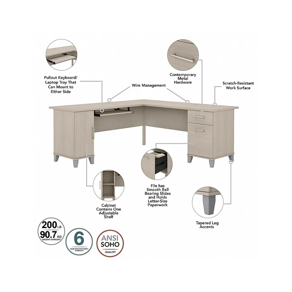 Maximize the potential of your home office with the Bush Furniture Somerset 72″W L-shaped desk. Create your remote work headquarters with space for a computer, phone, printer, and more on a surface that features wire management slots for keeping cords and cables in order. A convenient pull-out shelf provides a perfect place to keep a keyboard or laptop, and the desk also includes a vertical storage cabinet with an adjustable shelf. Place pens, paper, and more in the box drawer, and enjoy a file drawer gliding on smooth ball bearing slides for an easy reach to documents. Transitional styling includes a stylish finish with tapered legs and contemporary metal hardware for an alluring appearance. This desk with storage is tested to meet ANSI/SOHO standards for safety and performance and is backed by the 6-year manufacturer warranty. American-made with US and imported parts.