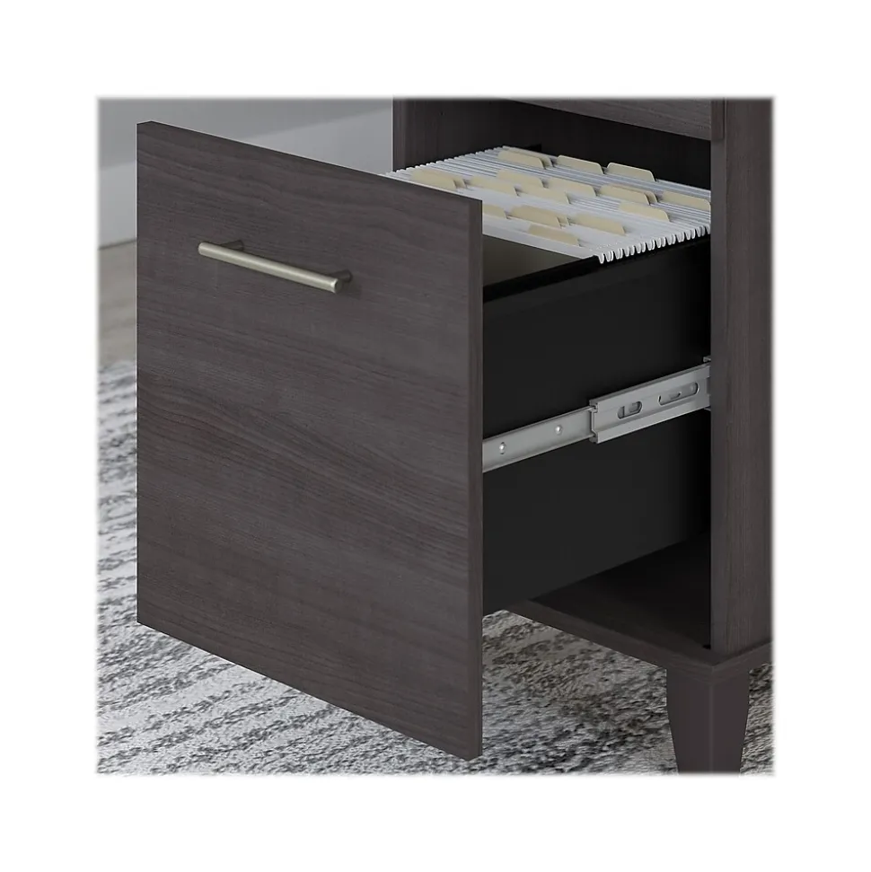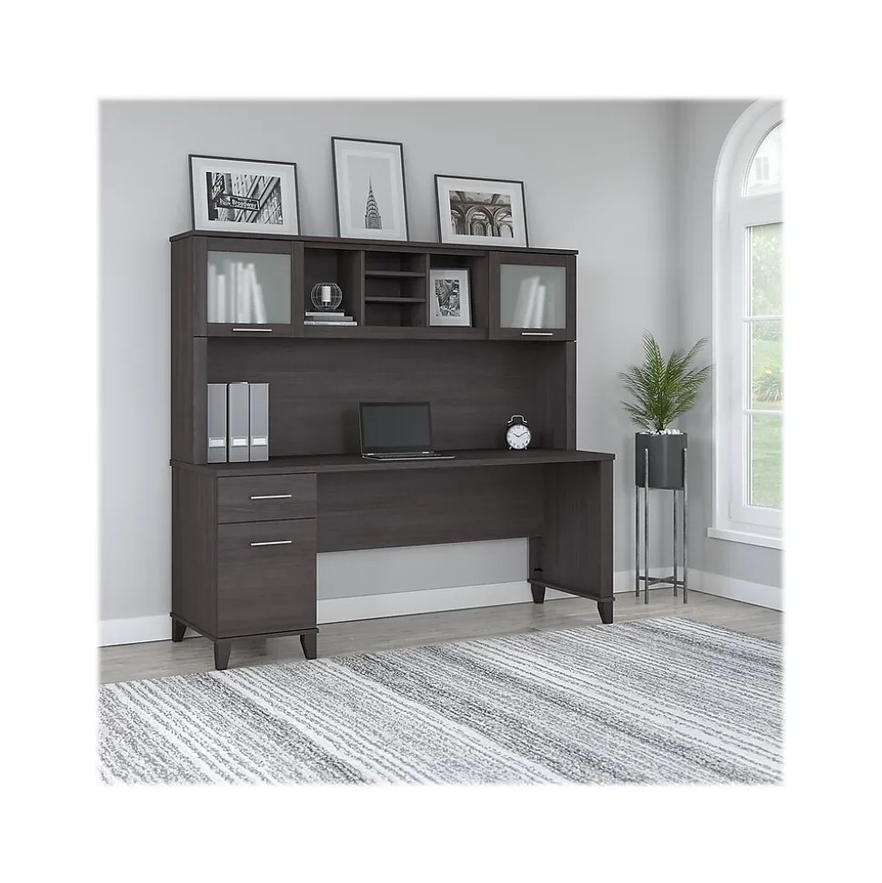 The transitional Bush Furniture Somerset 71″ office desk with hutch offers a stylish and practical workspace solution for the home or small office. A spacious work surface and plenty of storage capacity make this desk with drawers and hutch a perfect choice for your home office. Spread out with a computer and paperwork while multitasking on an expansive desktop that includes a wire management grommet to keep cords and cables in order. The desk’s file drawer opens on smooth full-extension ball bearing slides for easy access to legal- and letter-size documents, while a box drawer keeps the office supplies and utensils you need close by. The hutch attaches to the desktop and adds a pair of frosted glass doors for concealed storage in addition to open cubby spaces with two shelves for books, decorations, and more. This home office desk with drawers and hutch set is tested to meet ANSI/SOHO quality standards for safety and performance and is backed by the Bush Furniture 6-year manufacturer warranty.