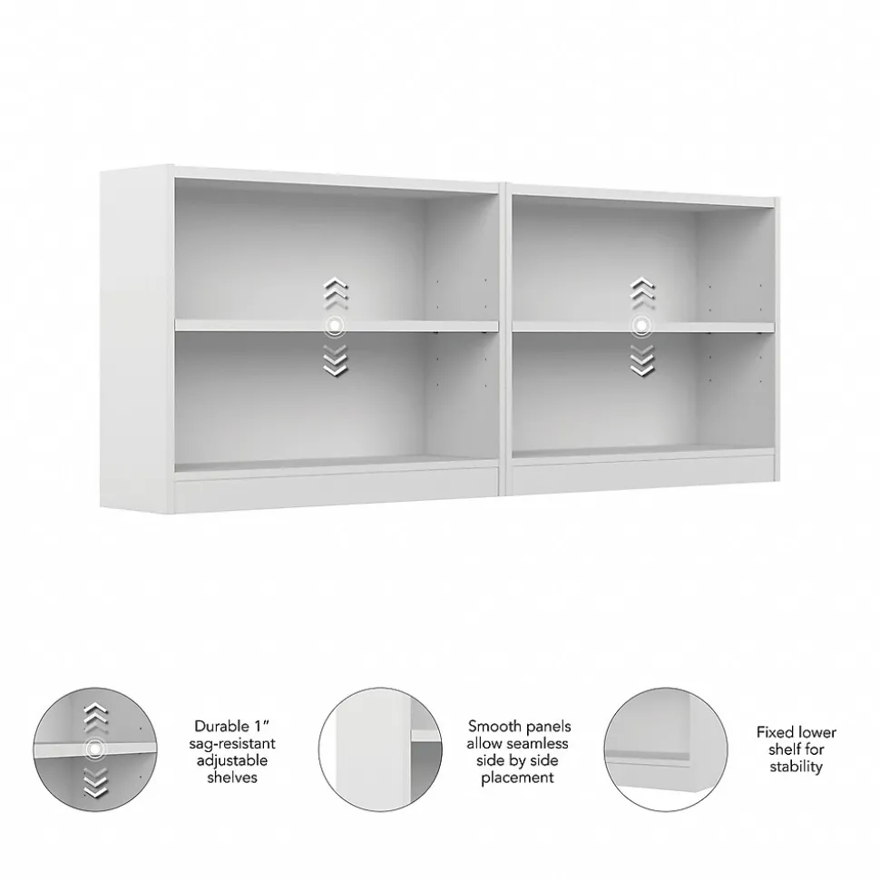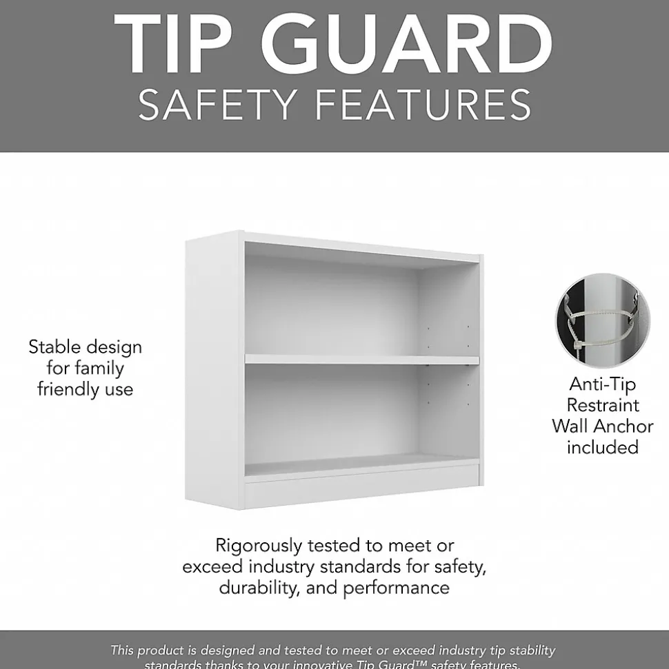 The Bush Furniture Universal Small 2 Shelf Bookcase – Set of 2 provides a versatile organization solution that makes it easy to show off your personal library or brighten up the room with pictures and decorations. A one-inch thick adjustable shelf prevents sagging and moves up and down to accommodate larger items like binders and photo albums while one fixed shelf gives the low bookcase added stability. Shelves have a weight capacity of 50 pounds each, so storing magazines, hardcover books, or vinyl records is never a problem. Tip Guard(TM) safety features include a stable design and wall attachment hardware for family-friendly safety in any space. This small bookshelf set meets ANSI/BIFMA quality standards for safety and performance and is backed by a 1 Year Warranty.