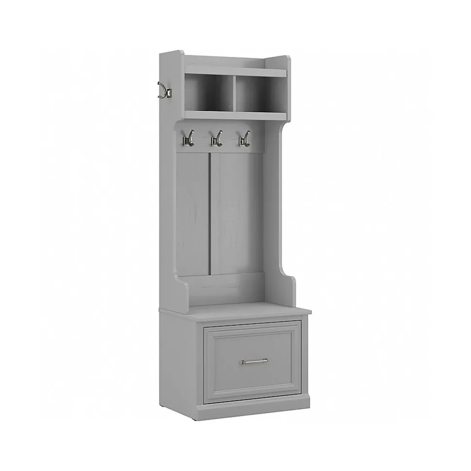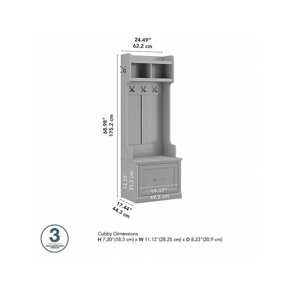 The Bush Furniture Woodland 24W Hall Tree and Small Shoe Bench with Drawer combines transitional styling and a practical design to offer an ideal entryway organizer. Have a seat on the durable bench and take a moment to relax as you get ready to head out the door or come home after a long day. The top of the mudroom bench supports 250 pounds, so you can sit down to put on and take off your shoes or set bags down with confidence. A small drawer opens on smooth ball bearing slides for easy access to footwear and accessories. The narrow Hall Tree features three coat hooks in the front and one on each side for hanging jackets, hats, and more. Smaller items like gloves and keys can be stashed inside two open compartments. This entryway bench with storage has been rigorously tested to meet Bush Furniture’s standards for safety, performance and durability and is backed by a 3 Year Warranty.