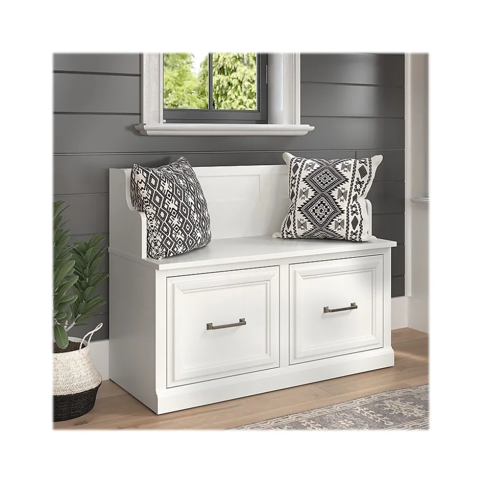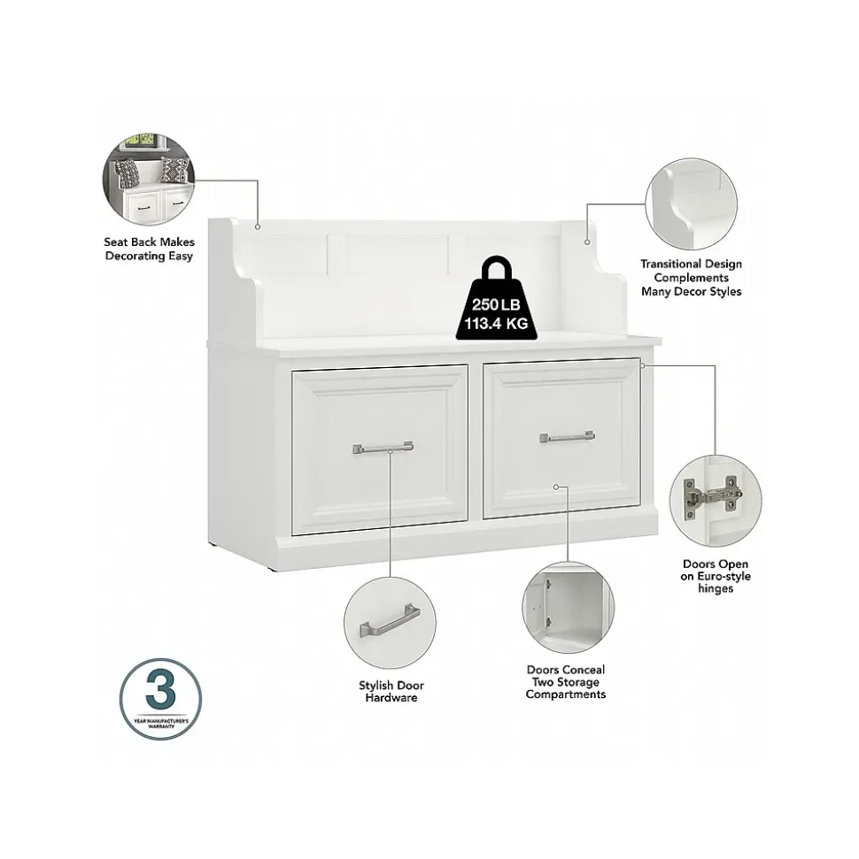 The Bush Furniture Woodland 40W Entryway Bench with Doors combines transitional styling and a practical design to offer an ideal shoe storage solution. Have a seat on the durable shoe bench surface and take a moment to relax as you get ready to head out the door or come home after a long day. The top of the mudroom bench supports up to 250 pounds, so you can sit down to put on and take off your shoes or set shopping bags down after a trip to the store with confidence. Cabinet doors conceal two internal compartments that keep footwear in order and out of sight. The entryway organizer’s transitional design blends elements of contemporary and traditional styling to complement a wide range of home furnishings. This storage bench with back has been rigorously tested to meet Bush Furniture’s standards for safety, performance and durability and is backed by a 3 Year Manufacturer’s Warranty.