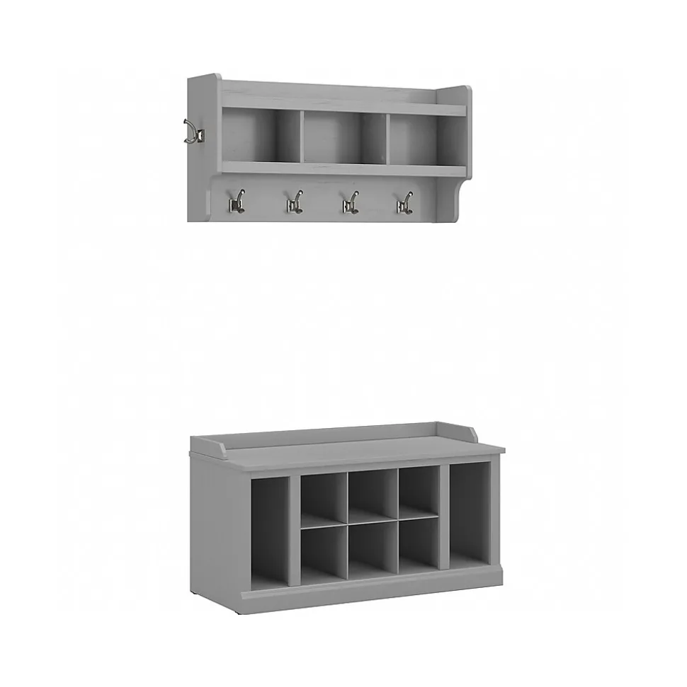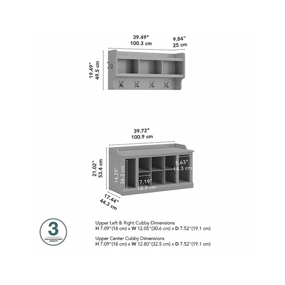 The Bush Furniture Woodland 40W Shoe Storage Bench with Shelves and Wall Mounted Coat Rack combines transitional styling and a practical design to offer an ideal entryway organizer. Have a seat on the durable bench surface and take a moment to relax as you get ready to head out the door or come home after a long day. The top of the mudroom bench supports 250 pounds, so you can sit down to put on and take off your shoes or set shopping bags down with confidence. Six cubby spaces and vertical shelves on either side keep footwear of all shapes and sizes in order. The wall shelf features six coat hooks for hanging jackets, hats, scarves and more. Smaller items like gloves and keys can be stashed neatly inside three open compartments. This entryway bench and coat rack has been tested to meet Bush Furniture’s standards for safety, performance and durability and is backed by a 3 Year Warranty.