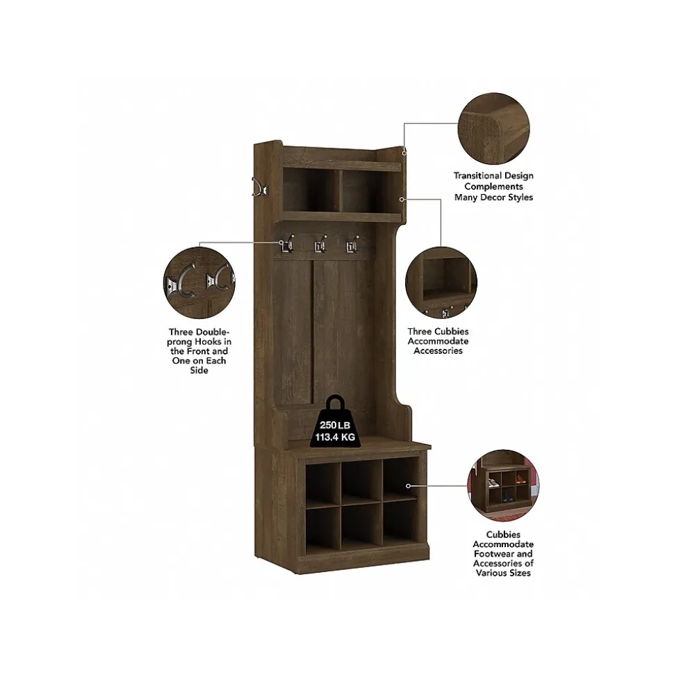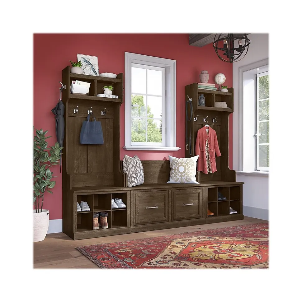 The Bush Furniture Woodland Entryway Storage Set with Hall Trees and Shoe Bench with Doors combines transitional styling and a practical design to offer an ideal organization solution. Have a seat on the durable storage bench and take a moment to relax as you get ready to head out the door or come home after a long day. Each section of the long mudroom bench supports 250 pounds, so you can sit down to put on and take off your shoes with confidence. Two small storage cabinets and cube shelving to the left and right accommodate footwear and accessories for a clutter-free entryway, mudroom or foyer. The narrow hall trees each include three coat hooks in the front and one on each side for hanging jackets, hats, scarves and more. This entryway bench and coat rack set has been tested to meet Bush Furniture’s standards for safety, performance and durability and is backed by a 3 Year Warranty.