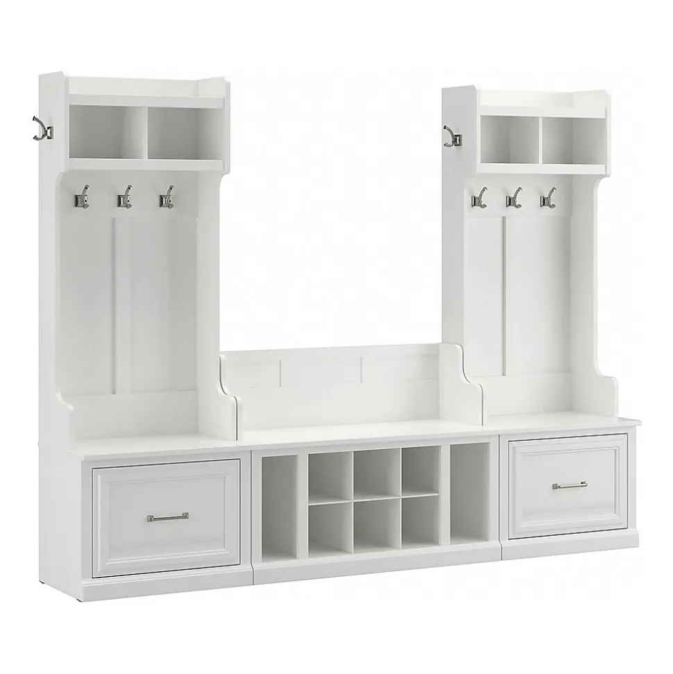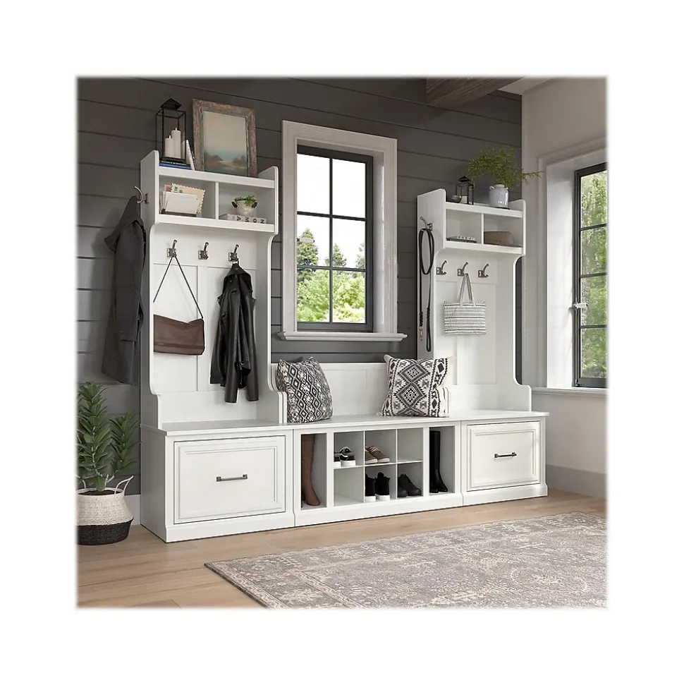 The Bush Furniture Woodland Entryway Storage Set with Hall Trees and Shoe Bench with Drawers combines transitional styling and a practical design to offer an ideal organization solution. Have a seat on the durable storage bench and take a moment to relax as you get ready to head out the door or come home after a long day. Each section of the long mudroom bench supports 250 pounds, so you can sit down to put on and take off your shoes with confidence. Vertical and cube shelving along with two small drawers to the left and right accommodate footwear and accessories for a clutter-free entryway, mudroom or foyer. The narrow hall trees include three coat hooks in the front and one on each side for hanging jackets, hats, and more. This entryway bench and coat rack set has been tested to meet Bush Furniture’s standards for safety, performance and durability and is backed by a 3 Year Warranty.