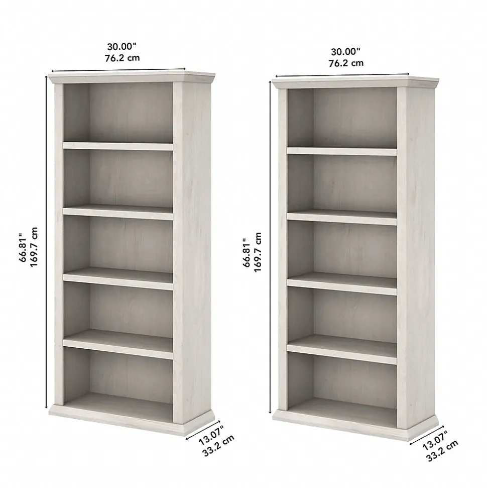 The Bush Furniture Yorktown tall five-shelf bookcase set of two presents a stylish and practical solution for organizing any work or living space. Use the matching bookcases to showcase your personal library or brighten up the room with pictures and home decor. Both bookcases include three adjustable shelves that move up and down to accommodate items of various sizes and two shelves that are fixed for stability. Each shelf supports up to 25 lbs., so you can store a collection of hardcover books and display larger decorations with confidence. Wall attachment hardware is included for family-friendly safety and security. Bush Furniture Yorktown’s classic charm is highlighted by stylish beveled edge detailing and comes in linen white oak finish. This tall bookcase set is tested to meet ANSI/SOHO standards for safety and performance and is backed by a 1-year manufacturer warranty.