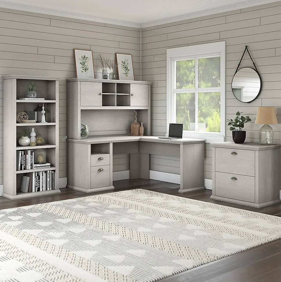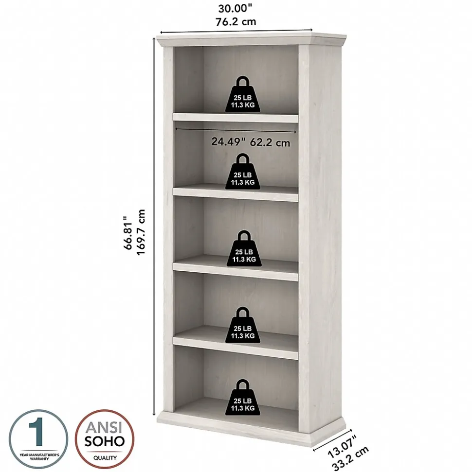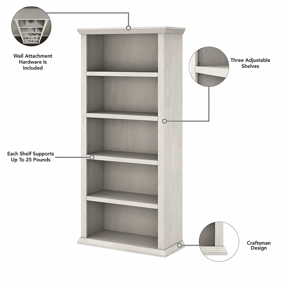 The Bush Furniture Yorktown tall five-shelf bookcase presents a stylish and practical solution for organizing any work or living space. Use the five-tier bookshelf to showcase your personal library or brighten up the room with pictures and home decor. Three adjustable shelves move up and down to accommodate items of various sizes while two shelves are fixed for stability. Each shelf supports up to 25 lbs., so you can store a collection of hardcover books and display larger decorations with confidence. Wall attachment hardware is included for family-friendly safety and security. Bush Furniture Yorktown’s classic charm is highlighted by stylish beveled edge detailing and comes in your choice of several attractive finishes. This vertical bookshelf is tested to meet ANSI/SOHO standards for safety and performance and is backed by a 1-year manufacturer warranty. See the full collection for coordinating items available.