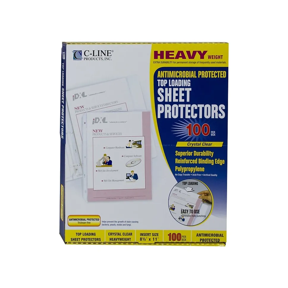 Store and file paperwork with these heavyweight sheet protectors. The antimicrobial protection inhibits the growth of bacteria and mold on product, and the clear construction keeps pages easy to read. Each protector features a prepunched edge for easy insertion into binders. These C-Line clear sheet protectors come with an acid-free finish to prevent ink and toner from lifting off the page.
