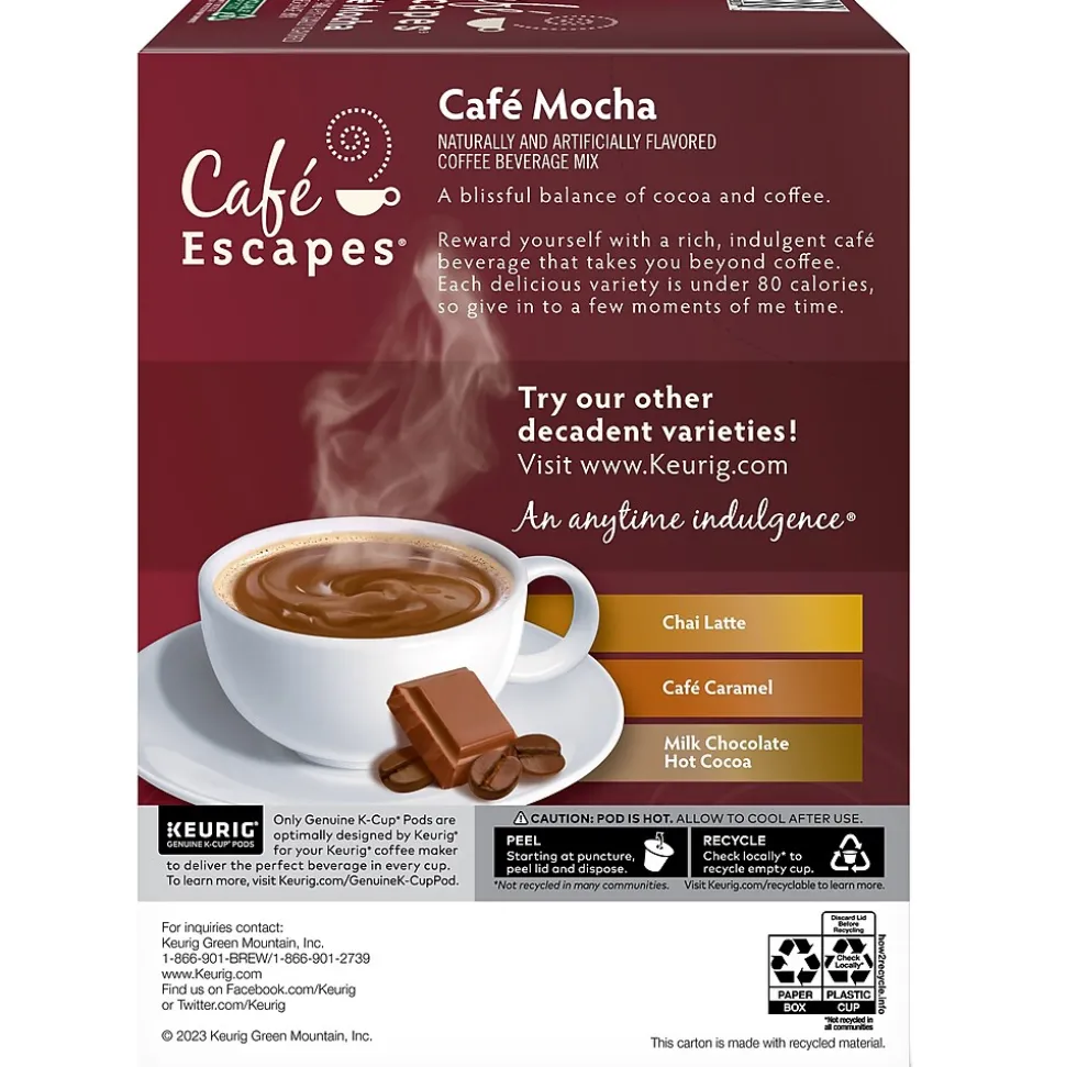 Brew a personal-sized cup of coffee with these easy-to-use Keurig K-Cup cafe mocha individual pods. The combination of chocolate and coffee provides a creamy and flavorful option any time of day. With no loose coffee or filters to fuss with, the Keurig Cafe Escapes cafe mocha K-Cups are a convenient and mess-free way to enjoy a quick cup of coffee.