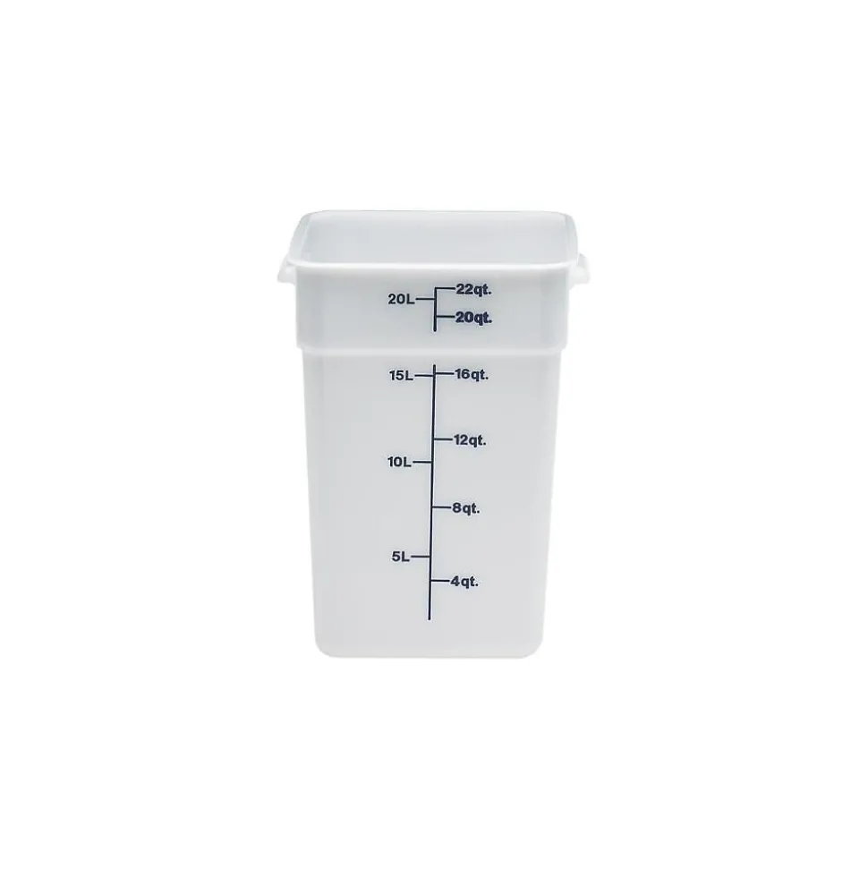 Maximize your storage space with this white 22 Qt. CamSquare container made of impact, stain and chemical-resistant polyethylene. It has easy-to-read blue graduations on the outside that let you take inventory at a glance, and you can pair this container up with the matching color-coded lid to keep things even better organized. This container withstands temperatures from -40 degrees F to 160 degrees F, making it good for both hot and cold food. WARNING: This product contains a chemical known to the State of California to cause birth defects or other reproductive harm.