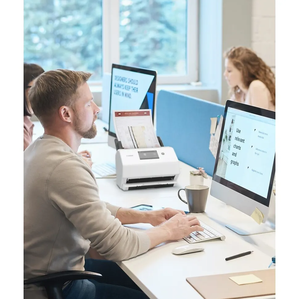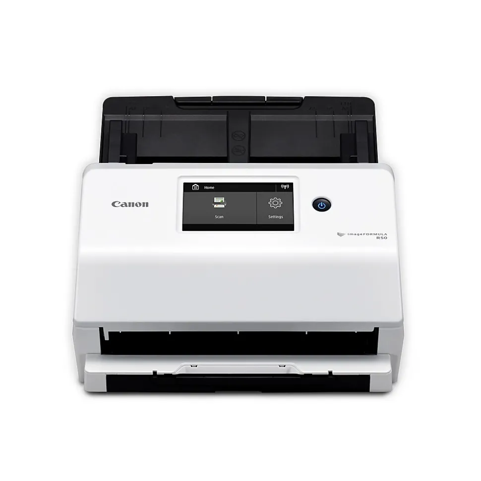 The Canon imageFORMULA R50 office document scanner with color touchscreen is simple to set up and easy to use. Connect via USB cable or Wi-FiĀ® network and quickly convert paper documents to searchable digital files.