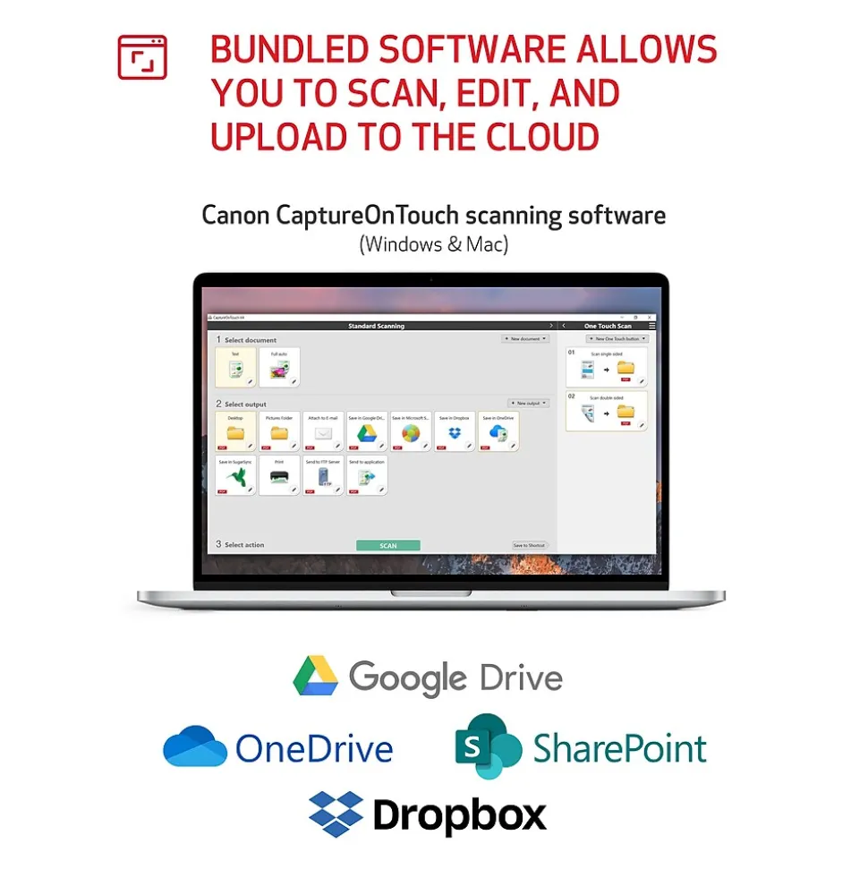 - Bundled Software:Canon CaptureOnTouch Scanning software, ReadirisPDF Software (Windows only) Cardiris (Windows only), TWAIN Drivers
