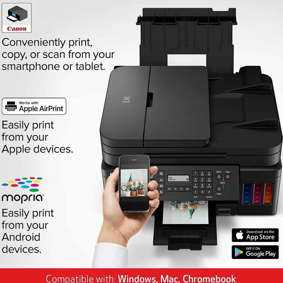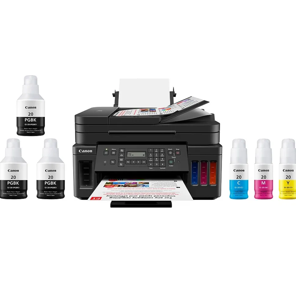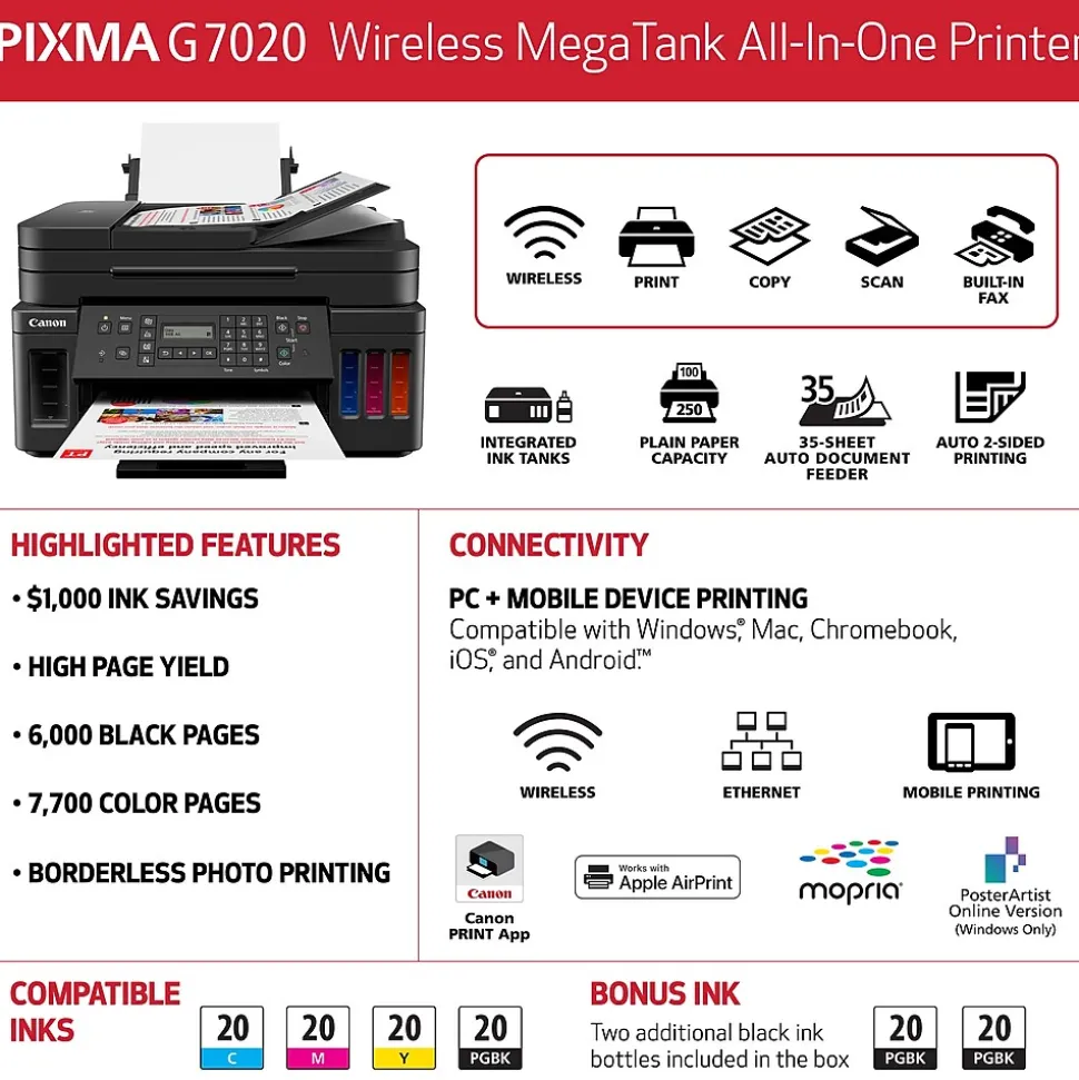 Meet the PIXMA G7020 MegaTank wireless all-in-one printer – designed for serious print productivity with a high page yield of up to 6000 pages of black text or up to 7700 vivid color pages per full ink bottle set from the reliable refillable ink system. The PIXMA G7020 MegaTank printer delivers outstanding high yields resulting in a low cost per page, and also features superior versatility thanks to an ADF for scanning, copying, and faxing. The G7020 allows you to keep working – even on large print jobs – with auto two-sided document printing, fast print speeds, and a combined 350-sheet plain paper capacity.