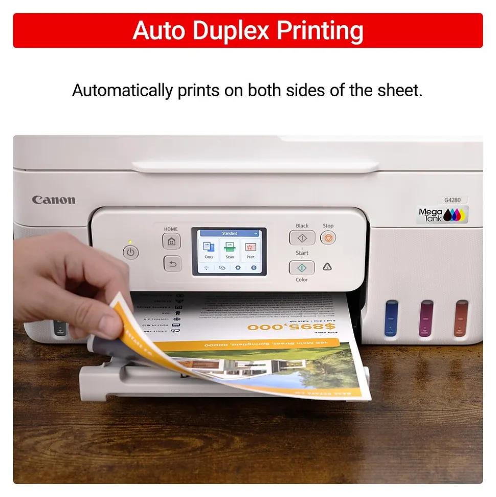Designed for home and home offices, the Canon PIXMA G4280 MegaTank All-in-One inkjet printer delivers high-quality, low-cost printing, and outstanding wireless connectivity in a compact size. Get serious print productivity with a high page yield of up to 6,000 Black / 7,700 Color pages per full ink bottle set and a low cost per print – MegaTank means Mega Savings. The PIXMA G4280 comes with a full set of ink, so you can print with confidence. The PIXMA G4280 is easy to set up and maintain and offers great media versatility to print on a variety of media types and sizes, including photo paper, envelopes, banners and more. Use Poster Artist Online to create professional-posters, banners and signage. Print both documents and photos on a variety of paper types using a hybrid ink system with pigment black for sharp black text and dye-based colors for vivid borderless photos up to 8.5” x 11”. Produce crisp, colorful documents quickly and cost-effectively with fast print speeds and a high quality 4-color pigment-based ink system. Keep printing with a plain paper capacity of up to 100 sheets or 20 photo sheets (4”x6”). Easily connect and print through high-speed USB or wirelessly from computers or mobile devices. This comes with a 1-year limited warranty and is backed by Canon’s Service and Support network.