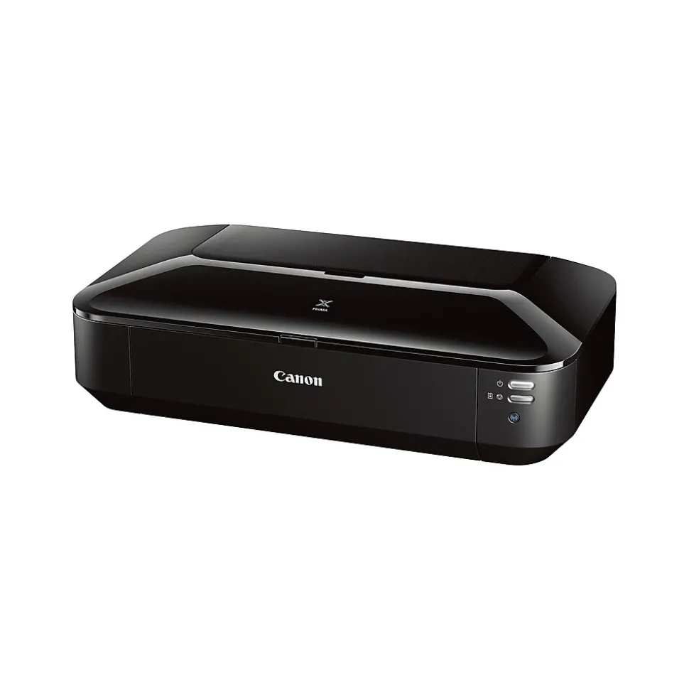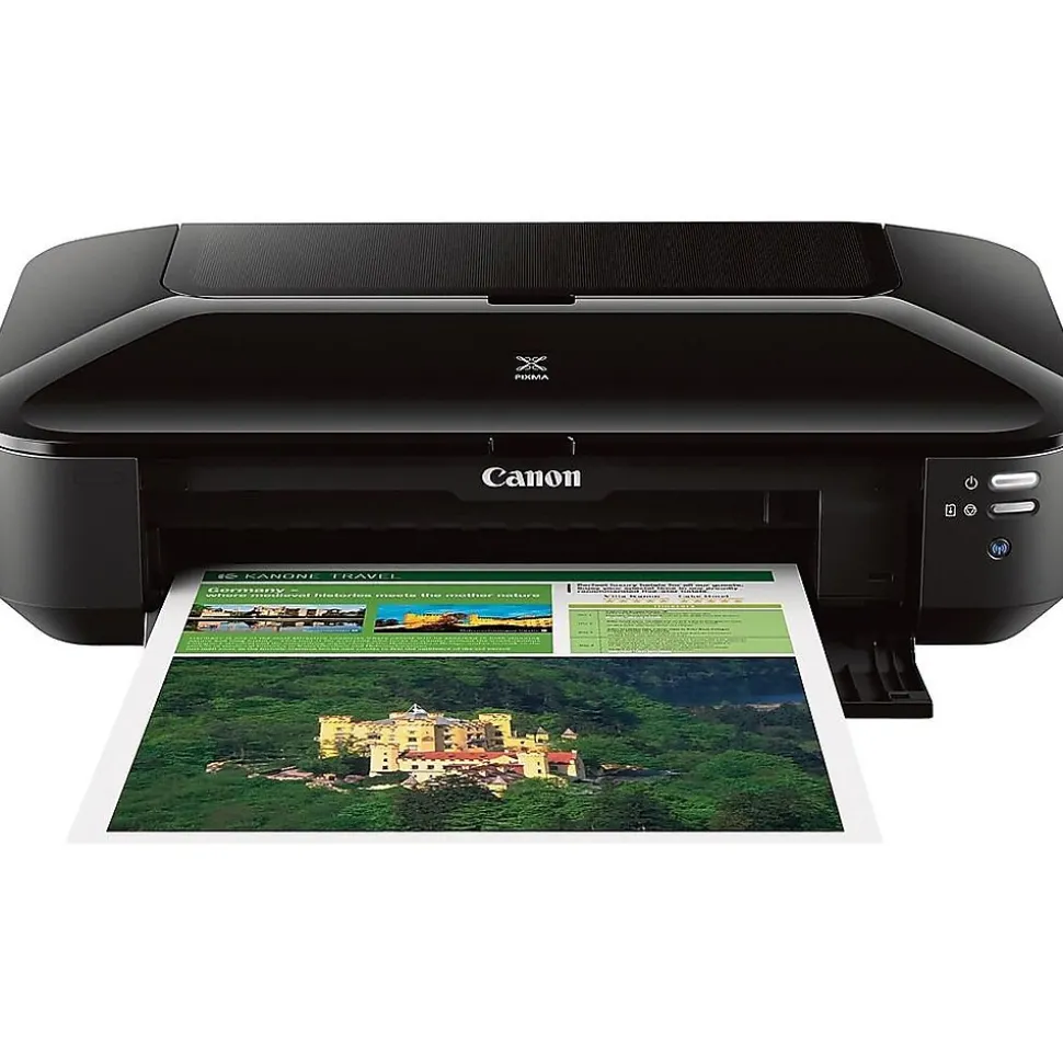 Bring rich, vivid detail to your business ideas with this color inkjet printer. Four dye-based color inks and a pigment-based black ink work together to create sharp detail and crisp clarity in your printouts, while the My Image Garden software lets you add filters, edit photos, and organize your designs. Full HD Movie Print software makes it easy to pull single images out of videos to produce stunning still photos. This printer comes equipped with built-in Wi-Fi and Ethernet, providing flexible connection options. Print images and documents directly from your compatible smartphone or tablet using AirPrint. Compatible with glossy, standard, photo, and a range of other paper types, this printer offers versatile document creation options. An auto sheet feeder keeps paper running smoothly as you handle multipage jobs. With its compact size, this Canon PIXMA printer takes up minimal space on your desktop, shelf, or credenza.