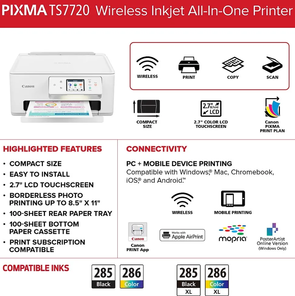 Welcome to simple and intuitive printing with the Canon PIXMA TS7720 wireless all-in-one printer. Easy to set up and use with a simple-to-replace two-cartridge FINE hybrid ink system, improved Wi-Fi setup through Wireless Connect, a rear paper tray for quick reloading of plain or photo paper, plus a flatbed scanner, the PIXMA TS7720 is more than your basic printer. You can also easily print from your mobile devices using the Canon PRINT app, AirPrint, Mopria Print Service, or from computers with built-in Wi-Fi. Print beautiful borderless photos up to 8.5″ x 11″ (letter size). Built-in auto duplex printing for convenience and paper savings. The PIXMA TS7720 is also compatible with the Canon PIXMA Print Plan Ink Subscription Service with flexible plans available where ink is delivered hassle-free right to your door automatically when you run low!