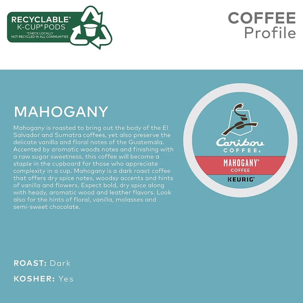 Enjoy a steaming cup with these coffee pods. Crafted to bring out the bold body of Sumatra and El Salvador coffees, these pods provide a strong flavor to get you going. These Caribou Coffee Keurig K-Cup coffee pods feature notes of floral and vanilla for a sweet touch, while the dry spice and woodsy accents offer a heady taste and aroma.