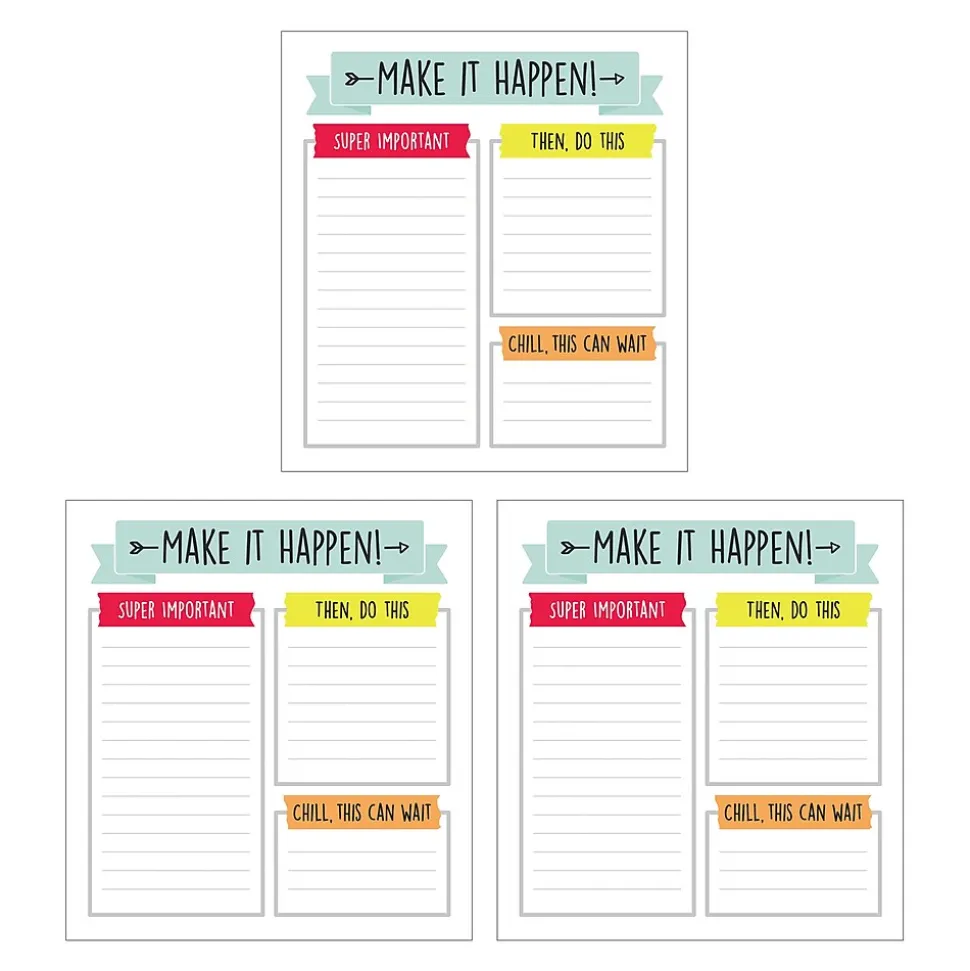 - What’s Included: The stationery set features 3 notepads with 50 sheets of acid-free, lignin-free lined paper per pad with 3 sections to help prioritize tasks under a motivational “Make It Happen” banner across the top.