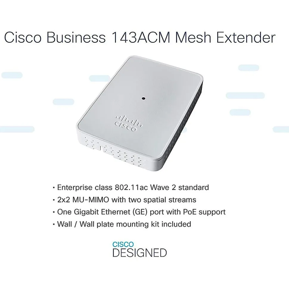 The Cisco CBW143ACM-B-NA 143ACM is a Wi-Fi range extender that is built to improve the coverage and performance of your existing wireless network. It operates in both the 2.4GHz and 5GHz frequency bands, making it a versatile solution for overcoming Wi-Fi dead zones and weak signals. The device is also equipped with 1 Gigabit Ethernet port, supporting high-speed wired connections, and complies with the 802.11ac 2×2 Wave 2 standard, ensuring fast and reliable wireless connectivity.