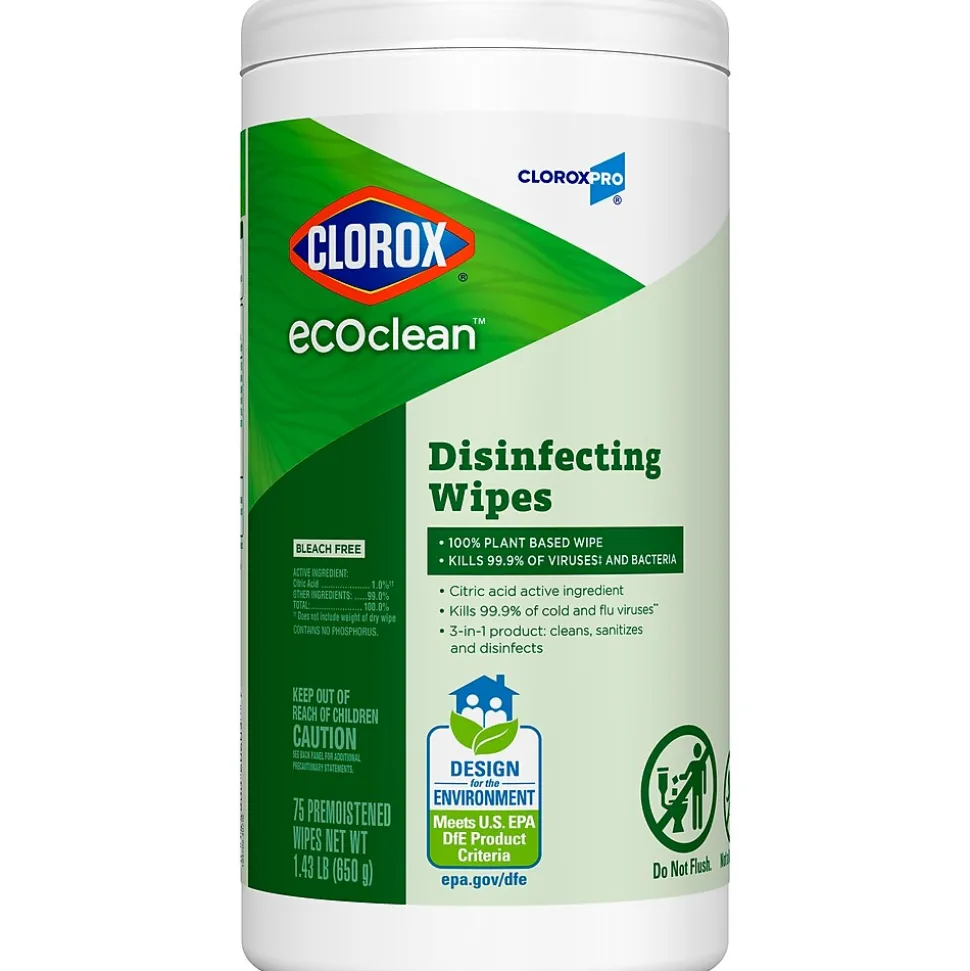 Clorox EcoClean. A Clorox clean that’s powered by nature*. These cleaning and disinfecting wipes are EPA Design for the Environment certified, have a 100% plant based cloth and are made without bleach, ammonia, alcohol or dyes. They kill 99.9% of germs* with a citric acid active ingredient that disinfects, sanitizes, cleans and removes allergens* from high touch surfaces without the need for gloves, goggles or personal protective equipment (PPE). Use them to quickly clean and disinfect kitchen counters, sinks, light switches, door handles, desks and chairs in commercial facilities like schools, colleges, offices, restrooms and hotels. Part of the Clorox EcoClean line of EPA Safer Choice and DFE certified products, EcoClean Disinfecting Wipes deliver a clean you can count on. *100% plant based active ingredient and substrate. When used as directed on hard nonporous surfaces. Pet dander, cockroach matter, pollen particles, dust mite particles.