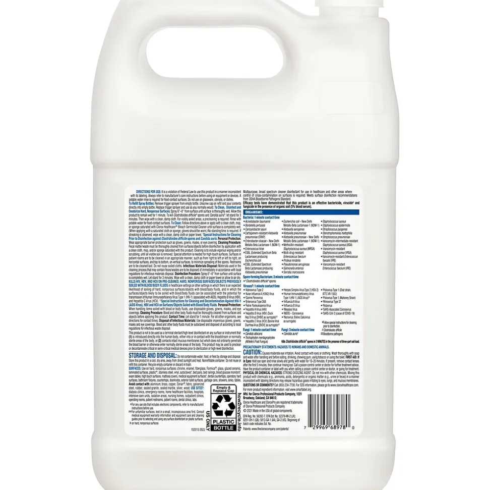 Your proven bleach solution for cleaning. Clorox Healthcare Bleach Germicidal Cleaner is a 1-step cleaner disinfectant that is EPA registered to kill C. difficile* and C. auris in 3 minutes and 50 other microorganisms in 1 minute or less.** This professional germicidal disinfectant contains a 1:10 bleach dilution to meet CDC & OSHA guidelines for disinfecting surfaces in healthcare settings and has proven efficacy against outbreak causing viruses, emerging viral pathogens, MRSA and VRE.Clean, disinfect, and deodorize surfaces with an optimized formula that leaves less residue behind. Use in healthcare settings including hospitals, medical facilities, dental offices, veterinary offices and long term care facilities. *Follow special instructions for cleaning prior to disinfection. **When used according to the disinfection directions. A precleaning step is required to kill Clostridioides difficile and Candida auris. ****Analysis of Clorox Healthcare customer sales data, November 2023.