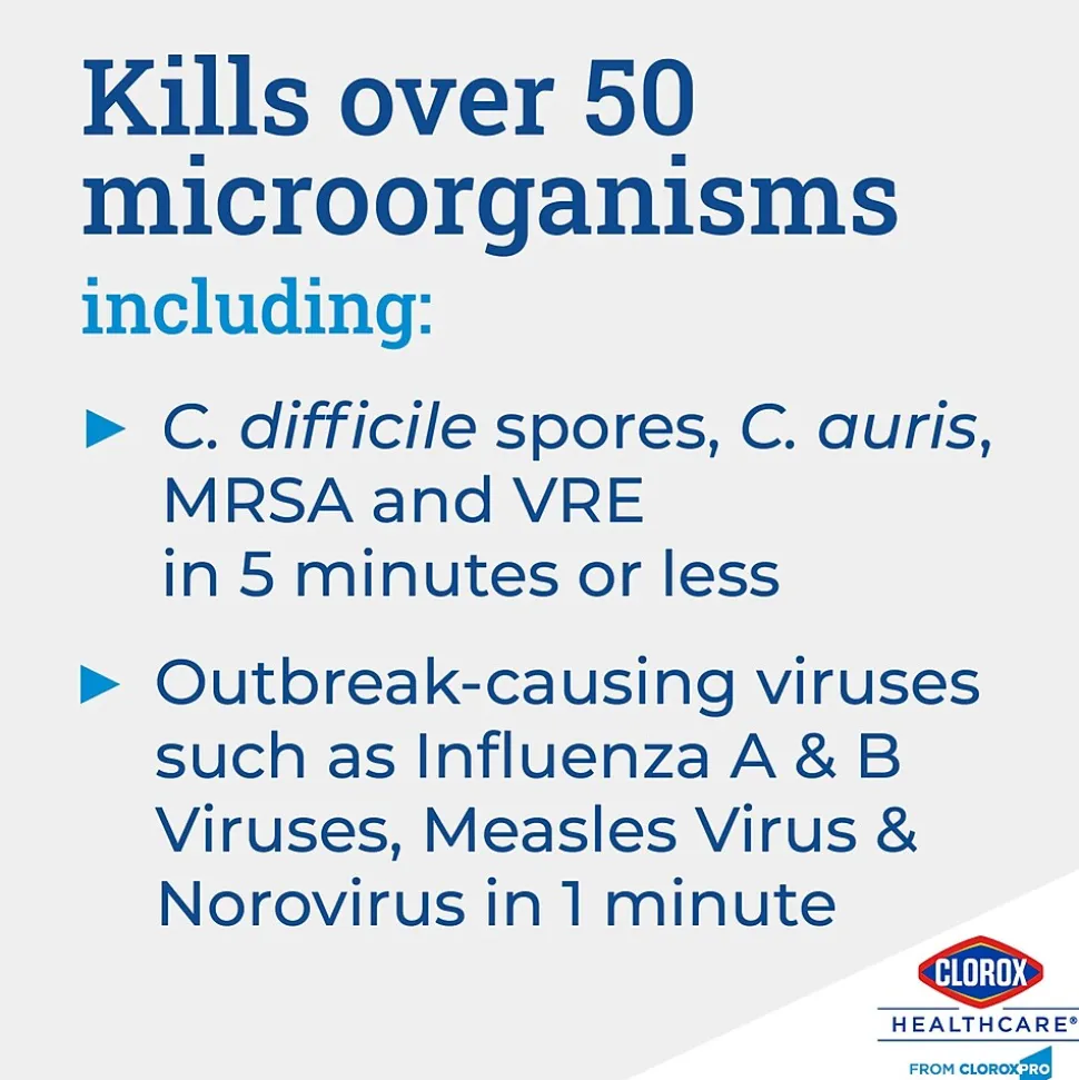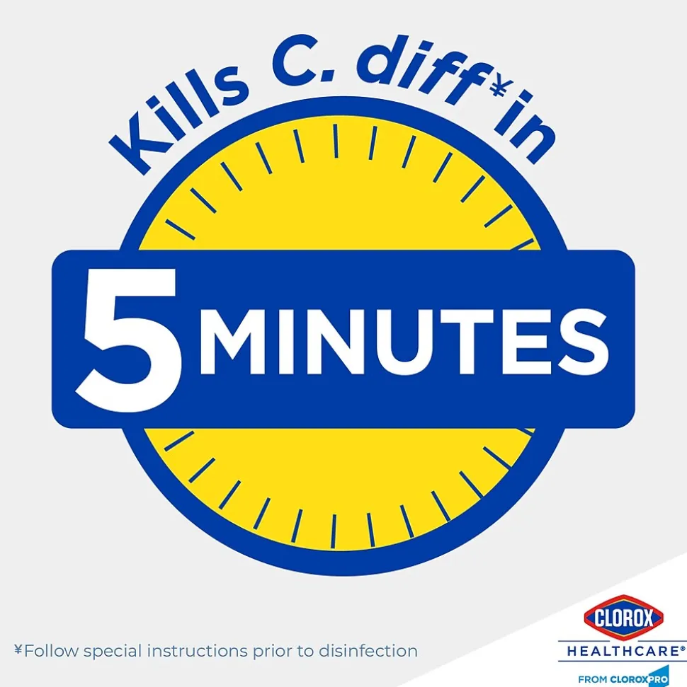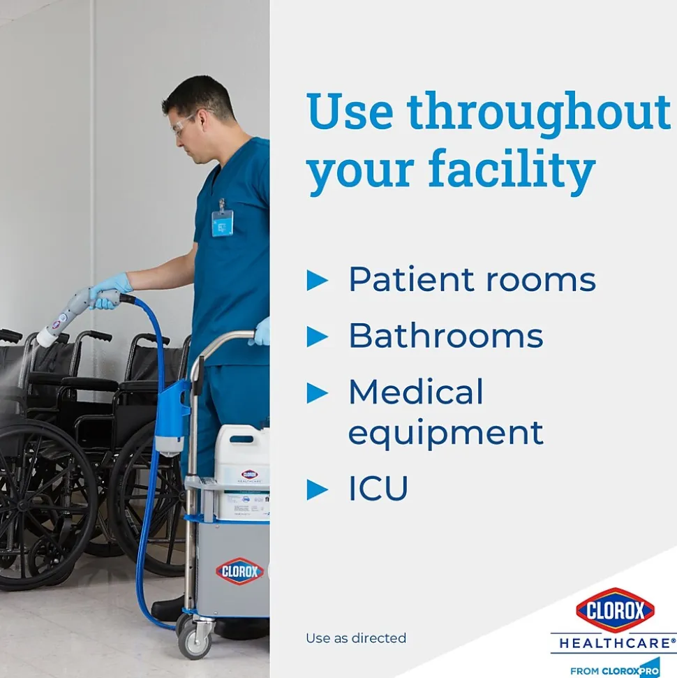 Clorox Healthcare Spore Defense is your low odor, easy on surfaces cleaner disinfectant for facility-wide use. It is intended for use with kills 45 microorganisms including C. difficile spores in five minutes and Bactericidal, Virucidal and Fungicidal in one minute. This Spore Defense cleaner meets EPA criteria for use against SARS-CoV-2, the virus that causes COVID-19. The closed system bottle designed for use with the Clorox Total 360 Electrostatic Sprayer. This one step cleaner disinfectant is compatible with a wide variety of surfaces including acrylic, chrome, aluminum, plastic, vinyl, glazed porcelain, PVC, plastic and stainless steel. Use this spore cleaner for floors, bed frames, infant incubators, showers, stretchers, wheelchairs and more. Most surfaces require spraying until thoroughly wet to meet contact times, let air-dry and then wipe clean. Ideal for use in clinics, doctor offices, emergency rooms, hospitals, patient rooms and more.