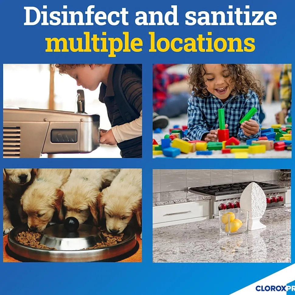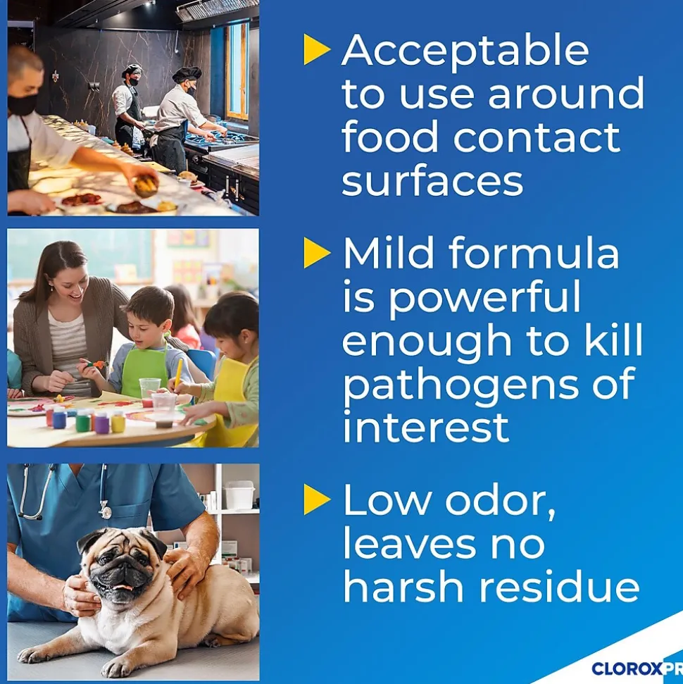 - GENTLE CLEANER: This Clorox spray is gentle enough to use around kids, pets and food contact surfaces; use for daycare equipment and desks, kennels, gym equipment, cafeteria table tops and much more