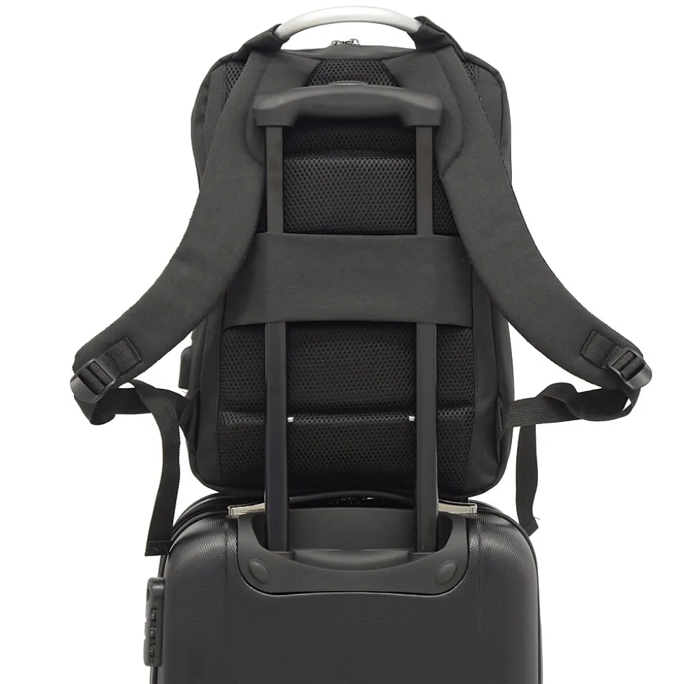 This smart backpack from Club Rochelier features 3 zippered compartments for better organization. Small front pocket stores smaller accessories like your iPad or cell phone. Second zipper pocket is spacious enough for your tablet and sports classification pockets for more organized storage. Main compartment features a secure laptop pocket and a hidden zippered compartment with USB cable and USB/Headphone ports. Comfortable padded backpack straps and Trolley strap makes this bag perfect for the business traveler or busy student.