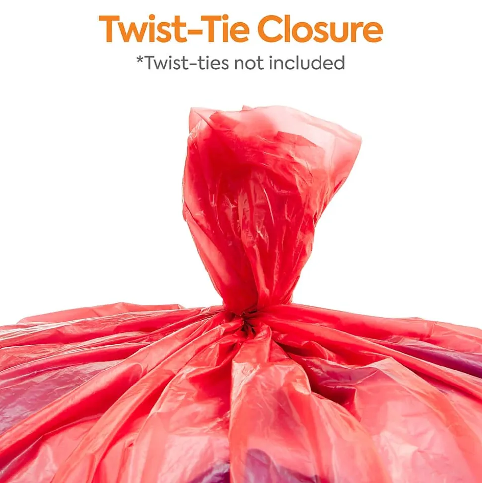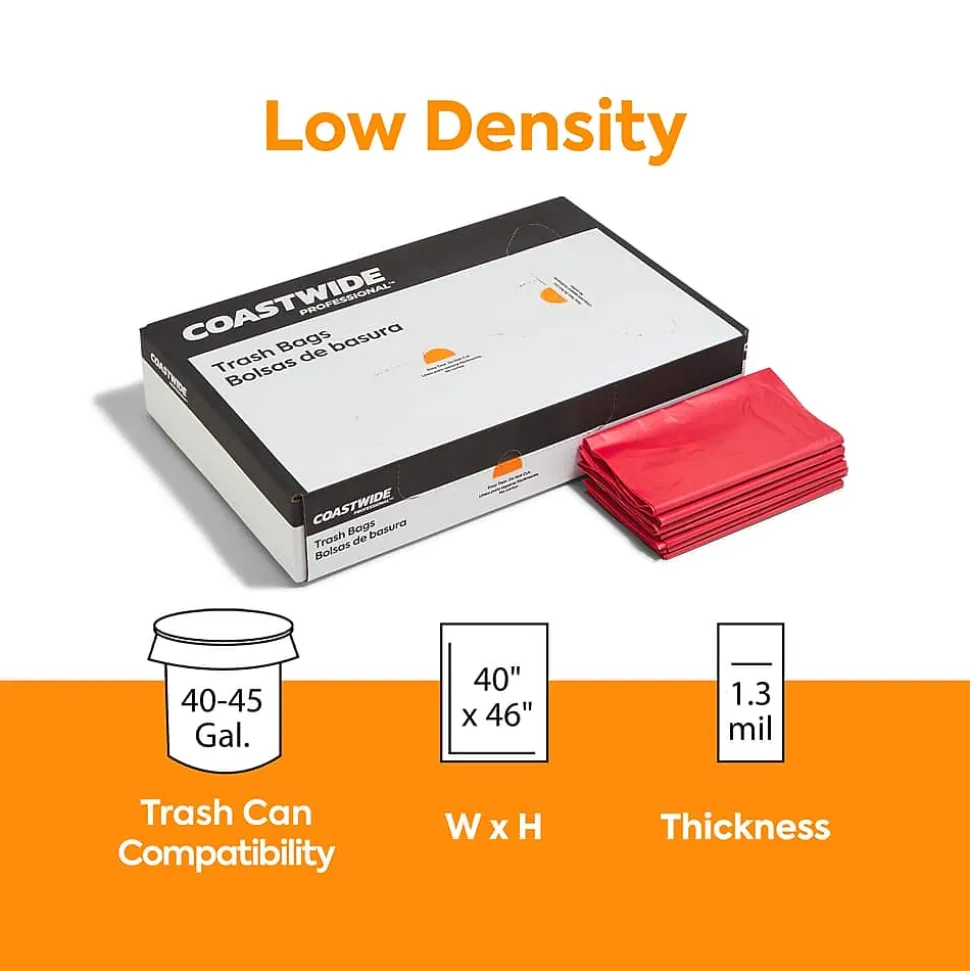 Reduce the risk of contamination at your facility with these biohazard trash bags. The 40 to 45-gallon capacity works well with industry-standard cans, and the red color with a printed message provides a warning of the potential handling risk. These 1.3-mil thick Coastwide Professional™ biohazard trash bags meet the federal and state regulations for tear and dart impact resistance to ensure safety.