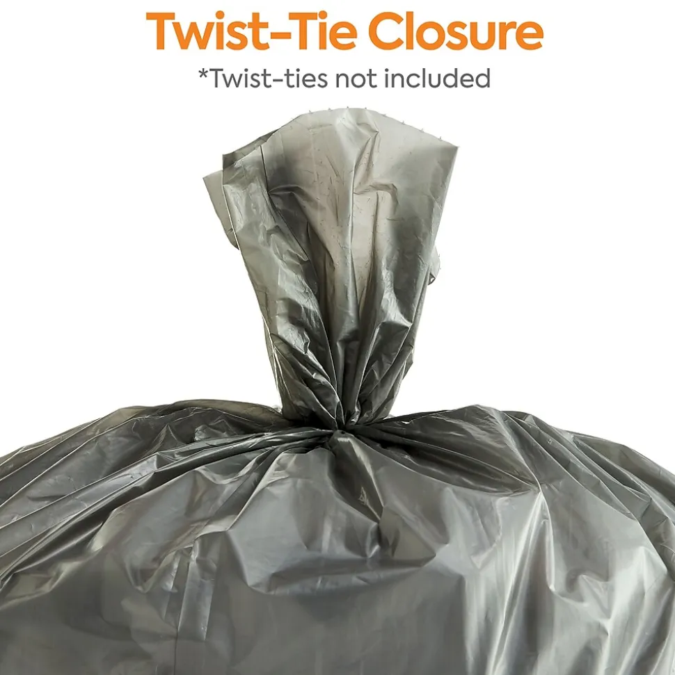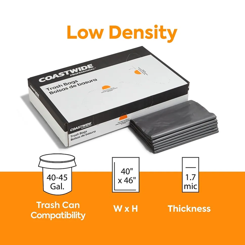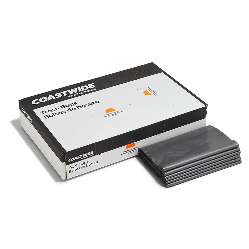 Maintain a safe, clean work environment with these sturdy trash bags. A star-sealed bottom keeps wet trash from leaking, and low-density polyethylene provides strength to resist punctures. With a silver-gray resin, these bags keep contents hidden from view for discretion. Versatile packaging lets these heavy-duty Coastwide Professional™ trash bags stack upright or sideways for convenient storage, and two dispensing options provide quick vertical or horizontal access.