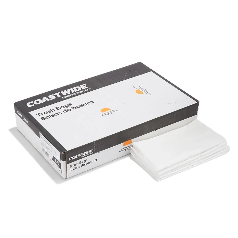 Keep your office clean with these trash bags. The 40 to 45-gallon size holds plenty of waste and fits in a variety of trash cans, and the low-density polyethylene construction resists tearing and stretching when containing heavy items. These white Coastwide Professional™ 40 to 45-gallon low-density trash bags have star-sealed bottoms that improve weight distribution and help prevent leaks.
