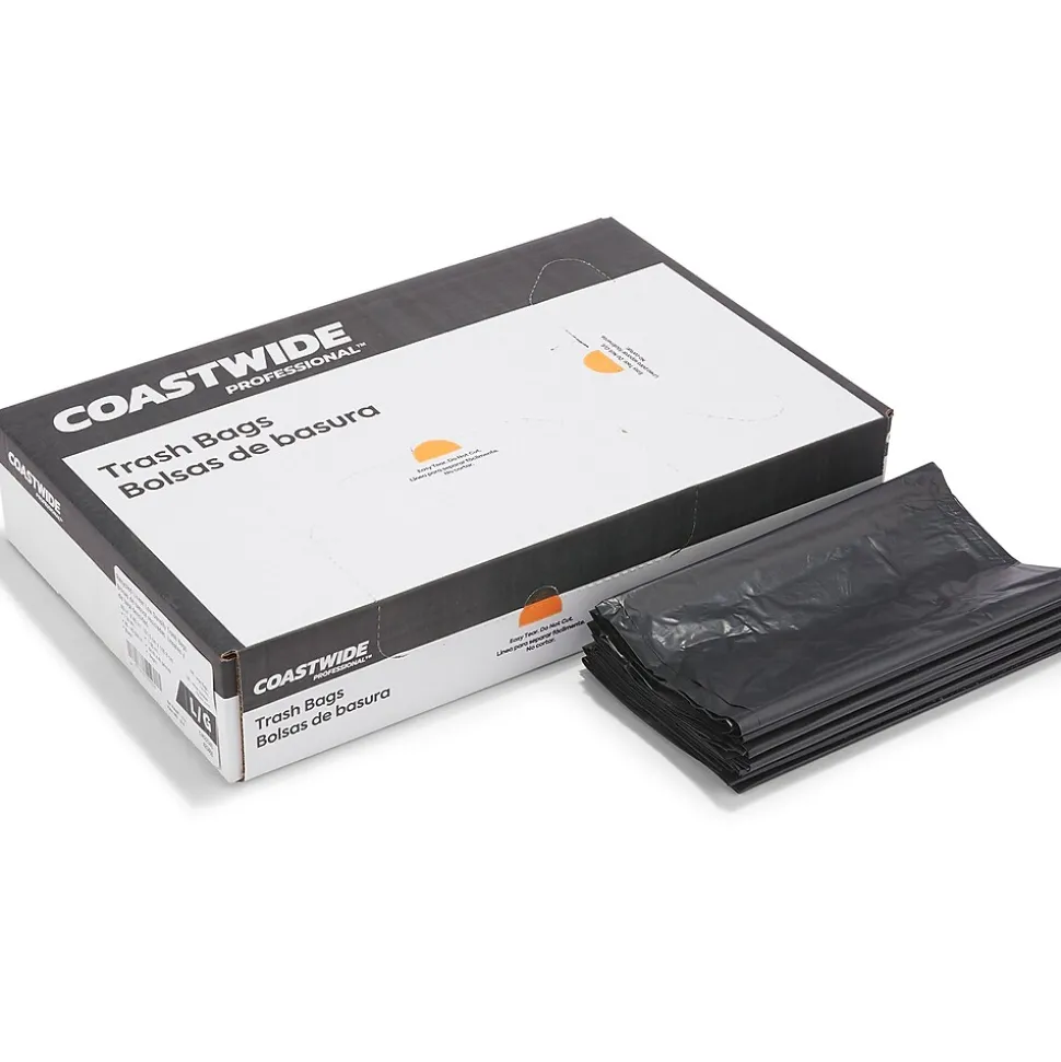 Dispose of food waste and junk mail with these trash bags. The prime resin material offers lasting durability, and the 40- to 45-gallon size provides compatibility with a variety of trash cans. These Coastwide Professional™ 40- to 45-gallon reprocessed resin trash bags have a super heavy-strength design that stands up to heavy loads and are black for discretion.