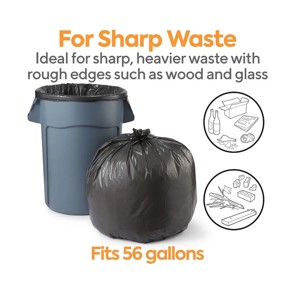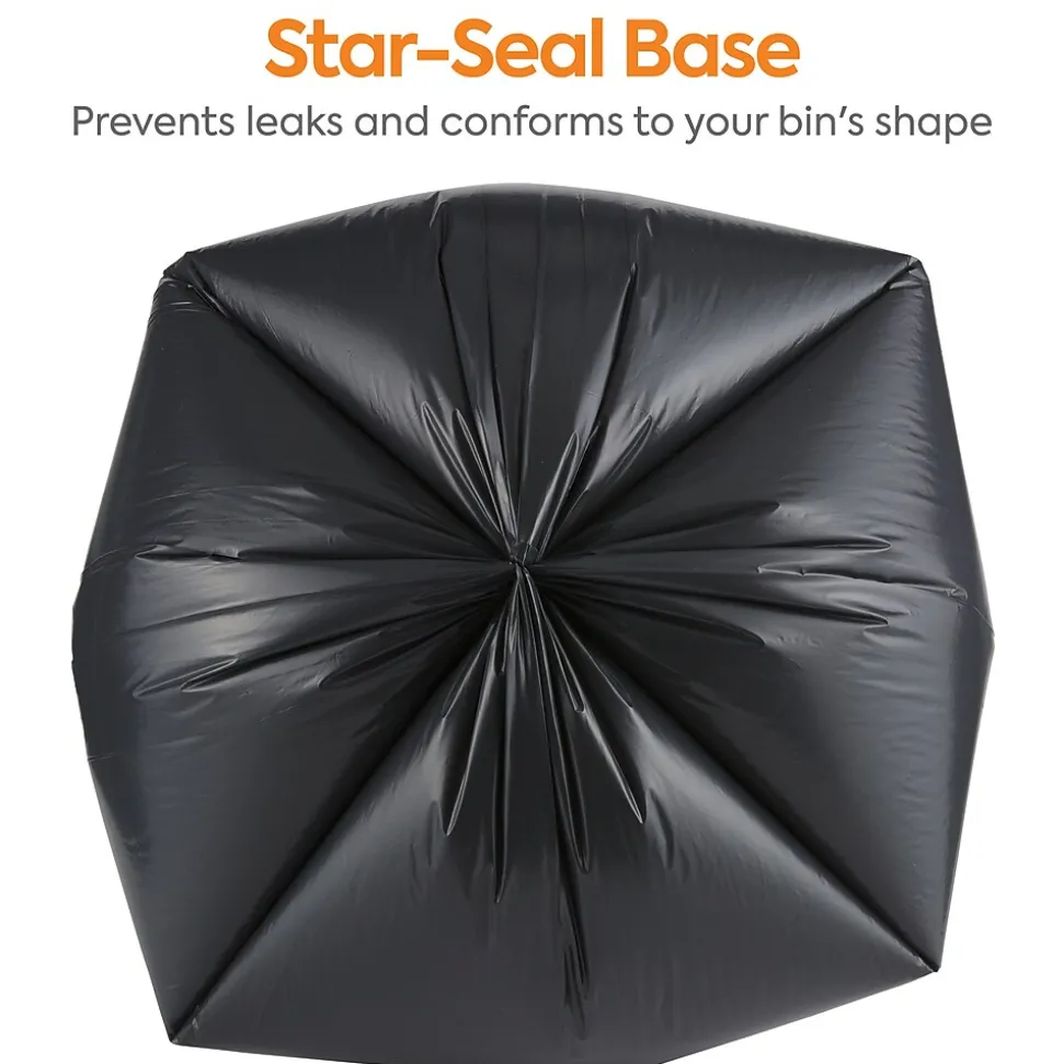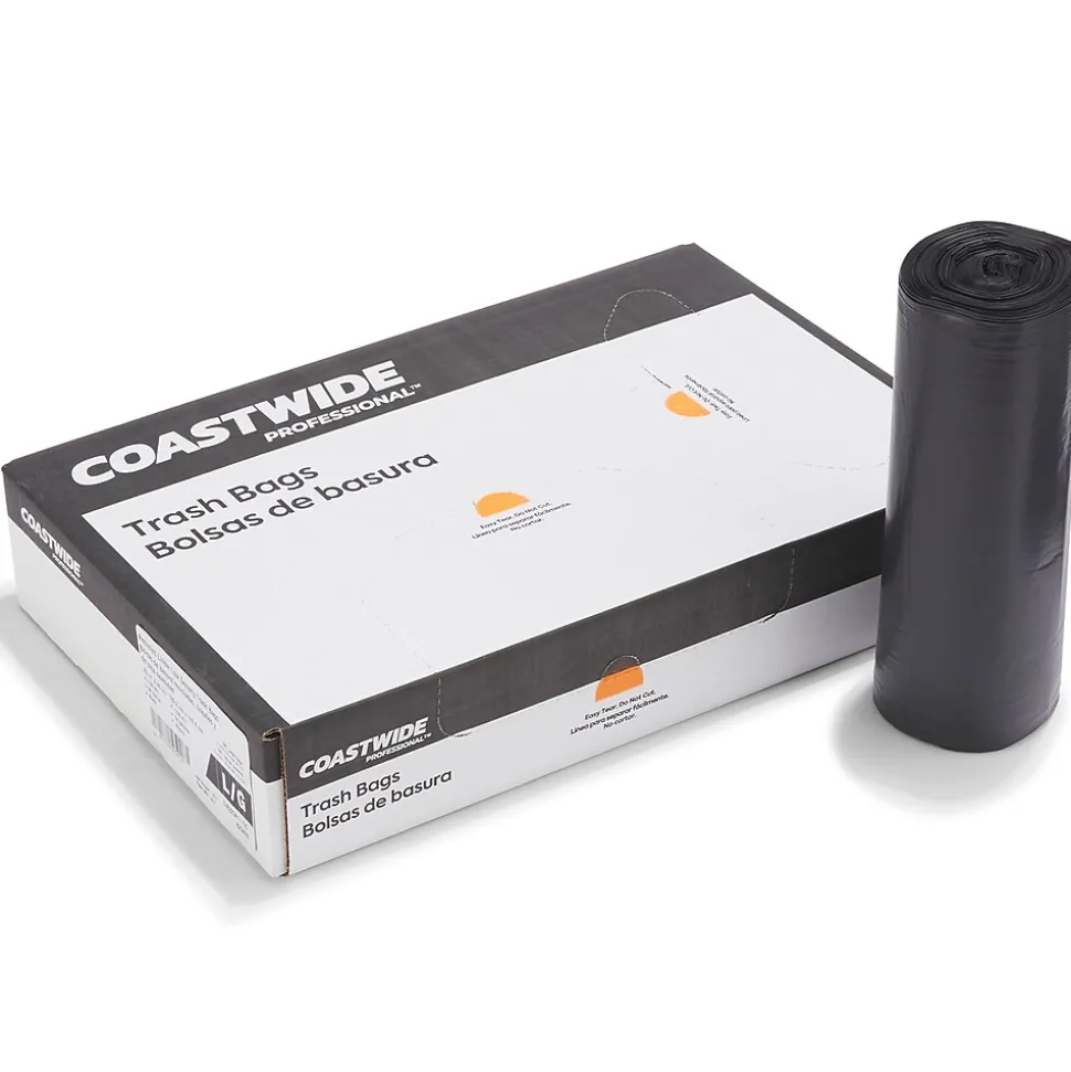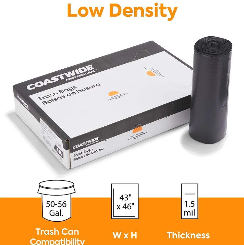 Load up your janitorial closet with this 100-count carton of trash bags. Each one holds up to 56 gallons for businesses that go through lots of garbage, while the star-sealed bottom helps prevent leaks when removing wet trash from office restrooms. The black coloring keeps contents hidden for a more pleasing look. These Coastwide Professional™ trash bags are made of reprocessed resin for added sturdiness and support.