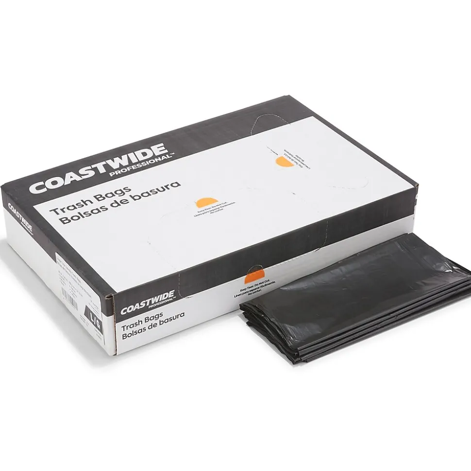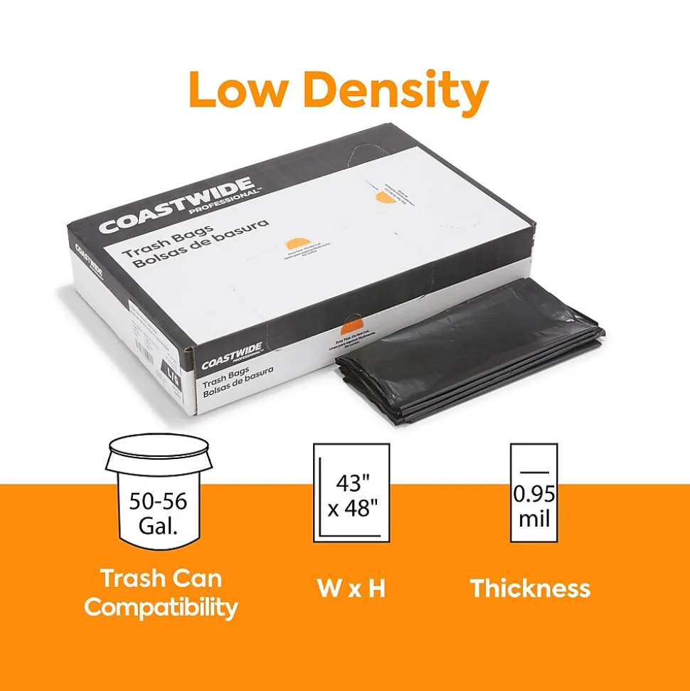 Stock a supply of these black trash bags to line your commercial bins. The opaque material keeps the contents hidden for discretion, while the low-density material prevents heavy objects from stretching or ripping to avoid leaks, making them suitable for cafeterias and other public spaces. Featuring a 50 to 56-gallon capacity, these Coastwide Professional trash bags provide plenty of room for garbage and have star-sealed bottoms to maximize carrying capacity.